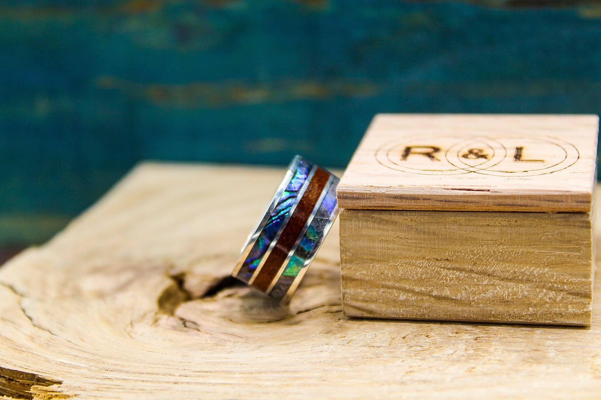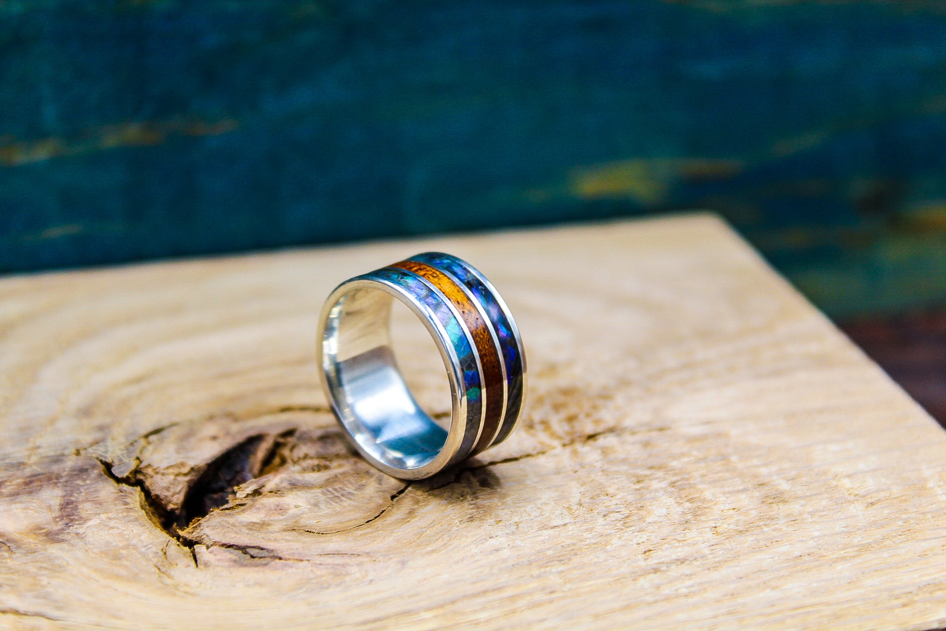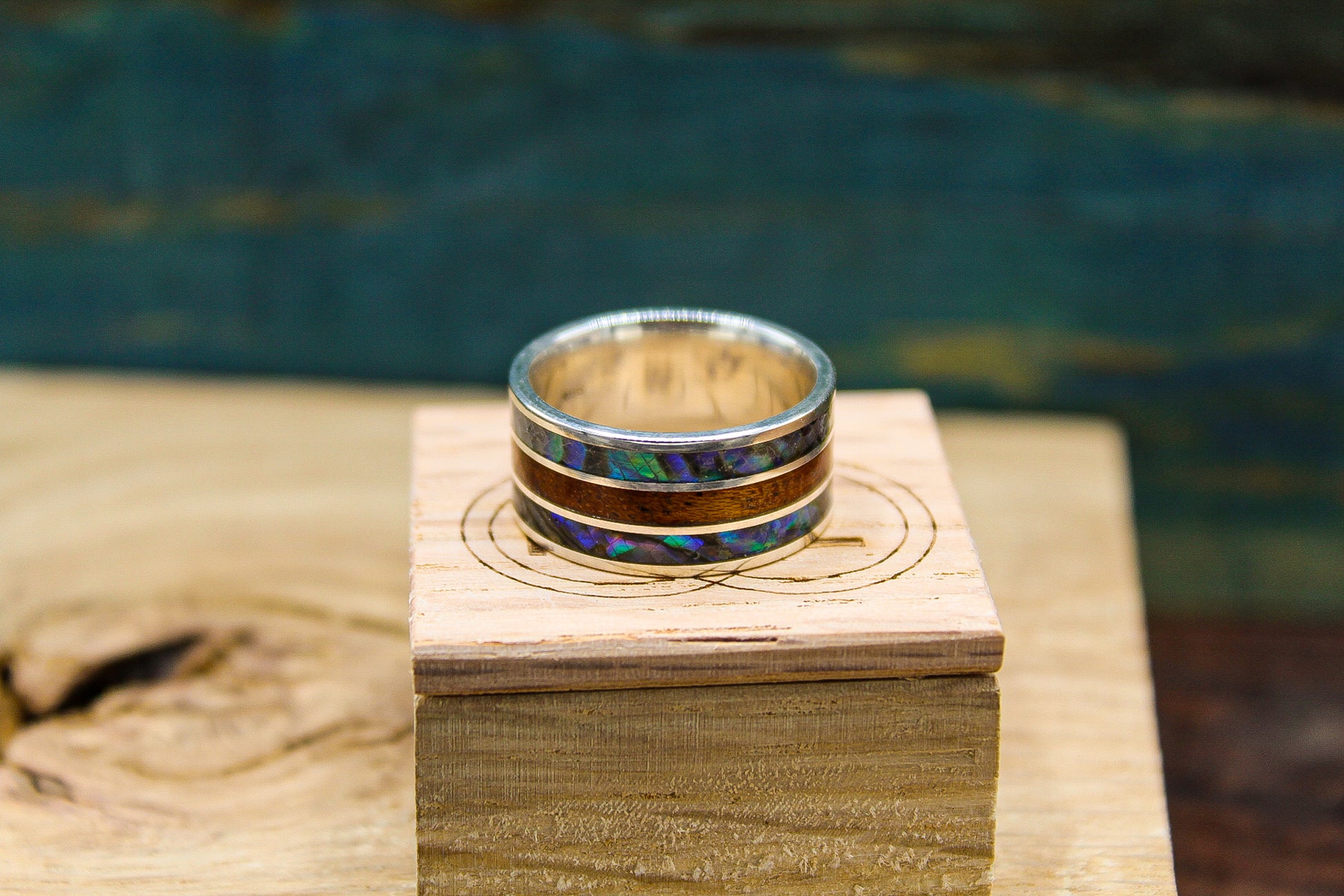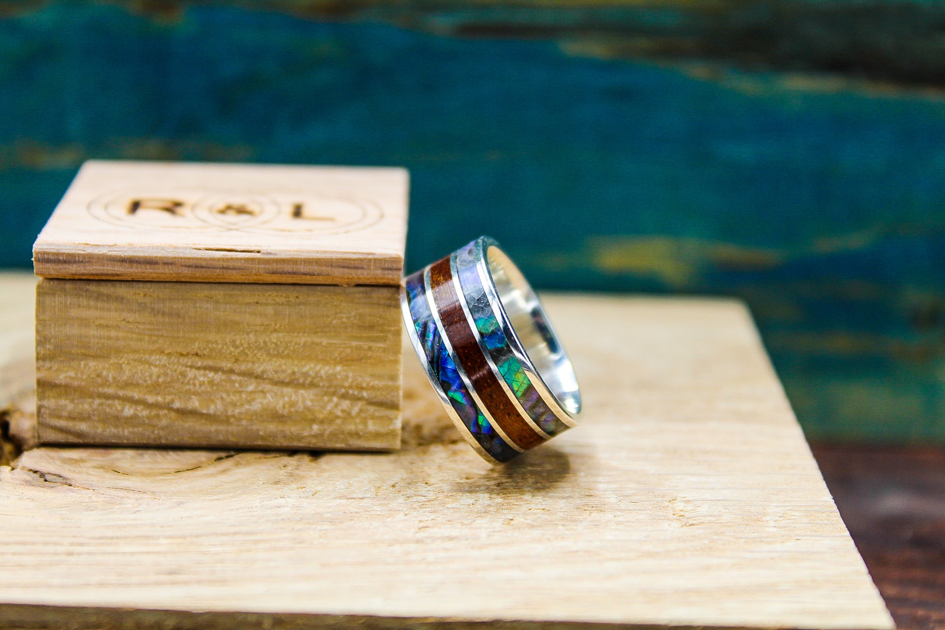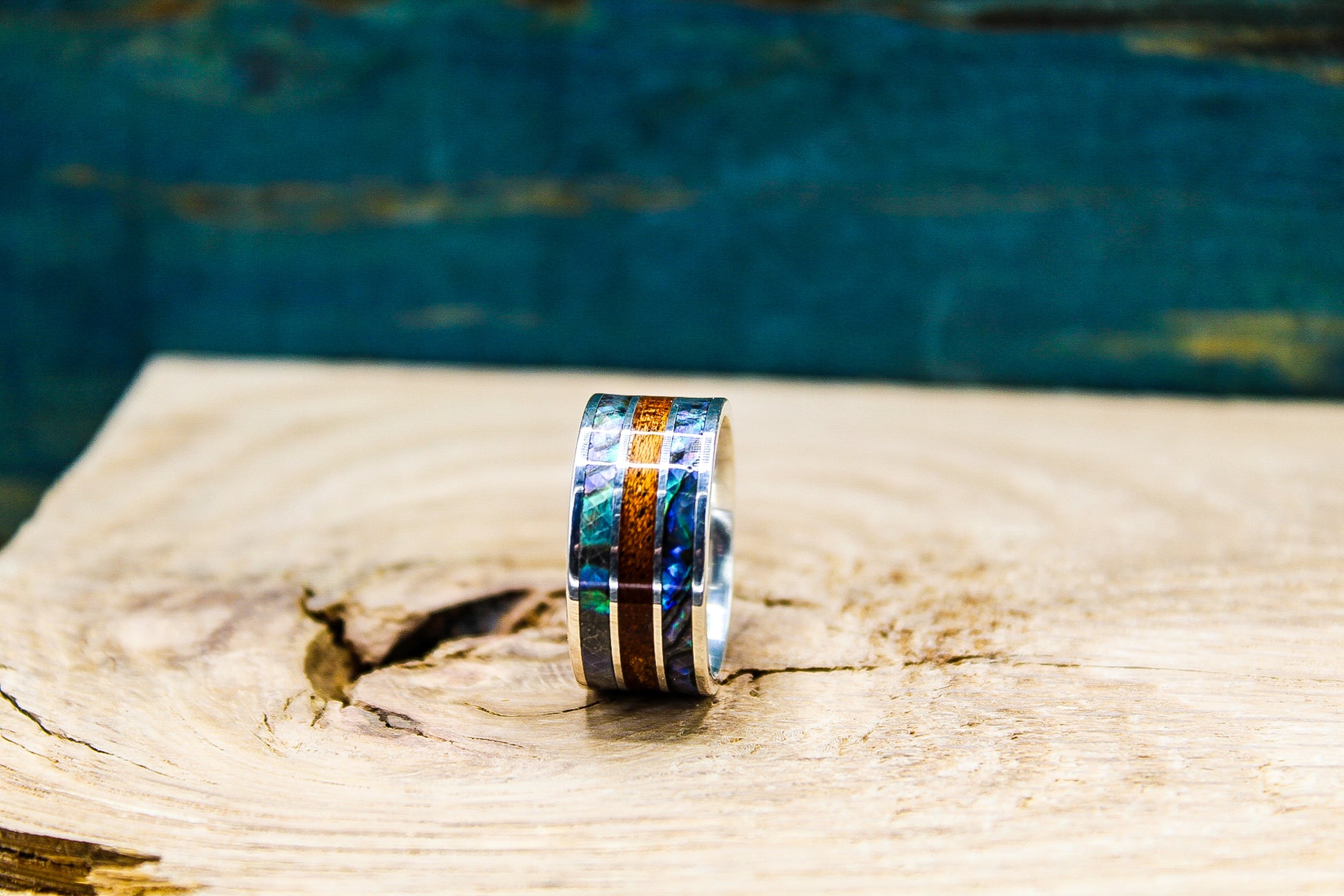Sterling silver, abalone and rich mahogany combine to create this stunner of a men's wedding band - we've taken one of our hand milled sterling silver bands and inlaid it with shimmering abalone and warm brown mahogany. This men's ring is made to order to your specifications and crafted with great attention to every detail. We love the contrast of the brilliant abalone with the richness of the wood.