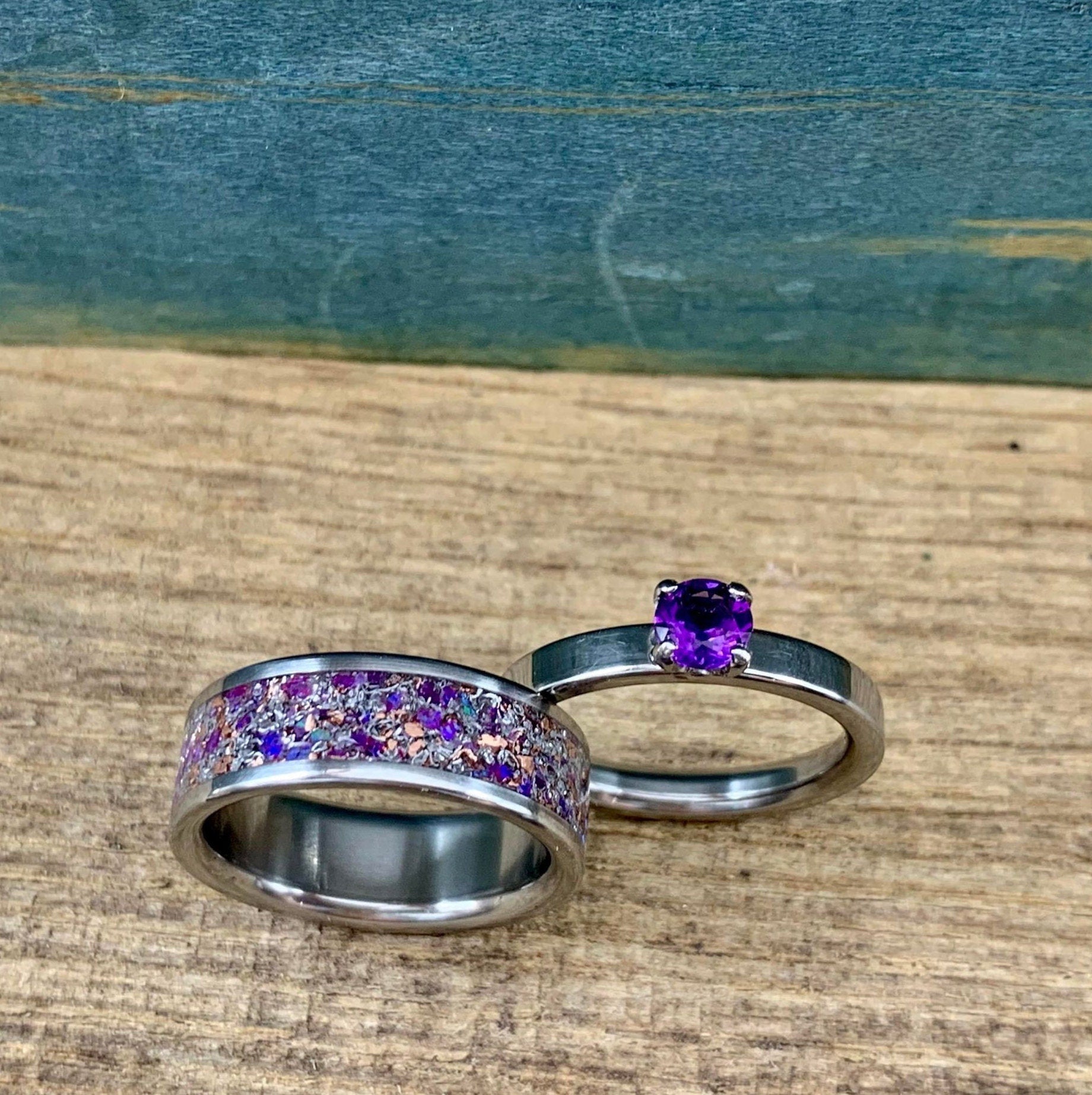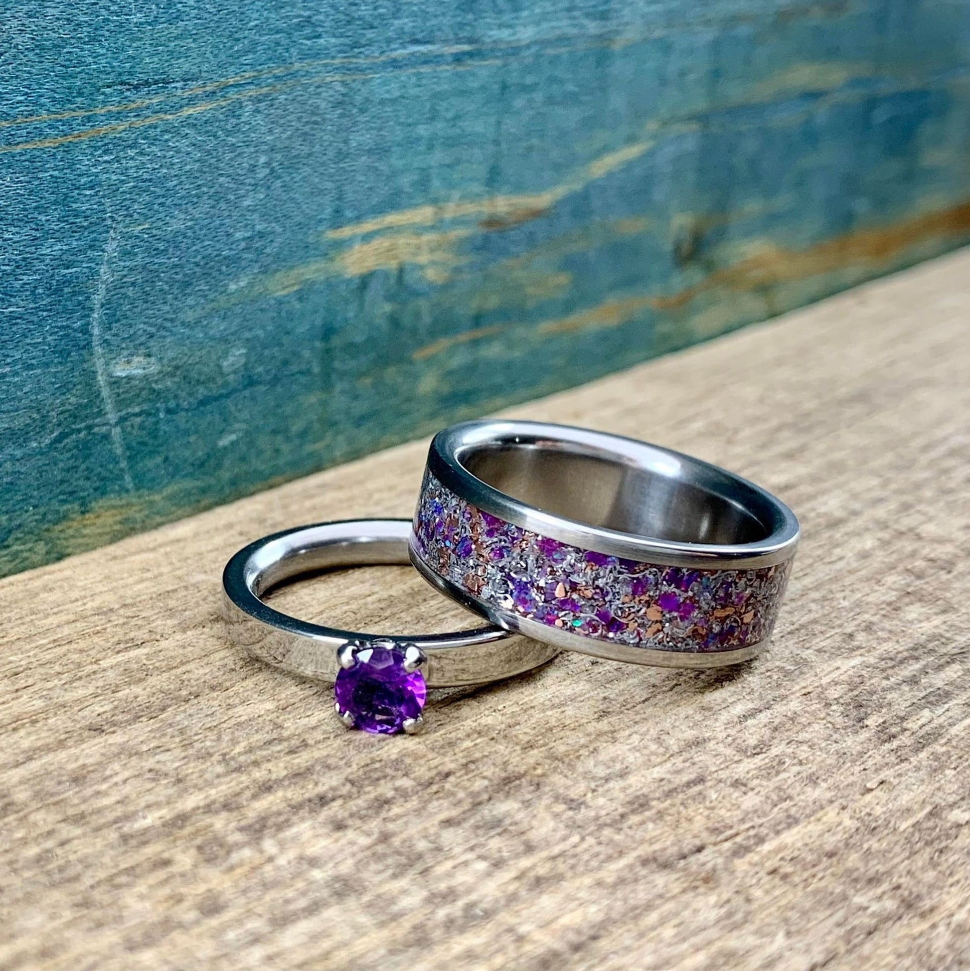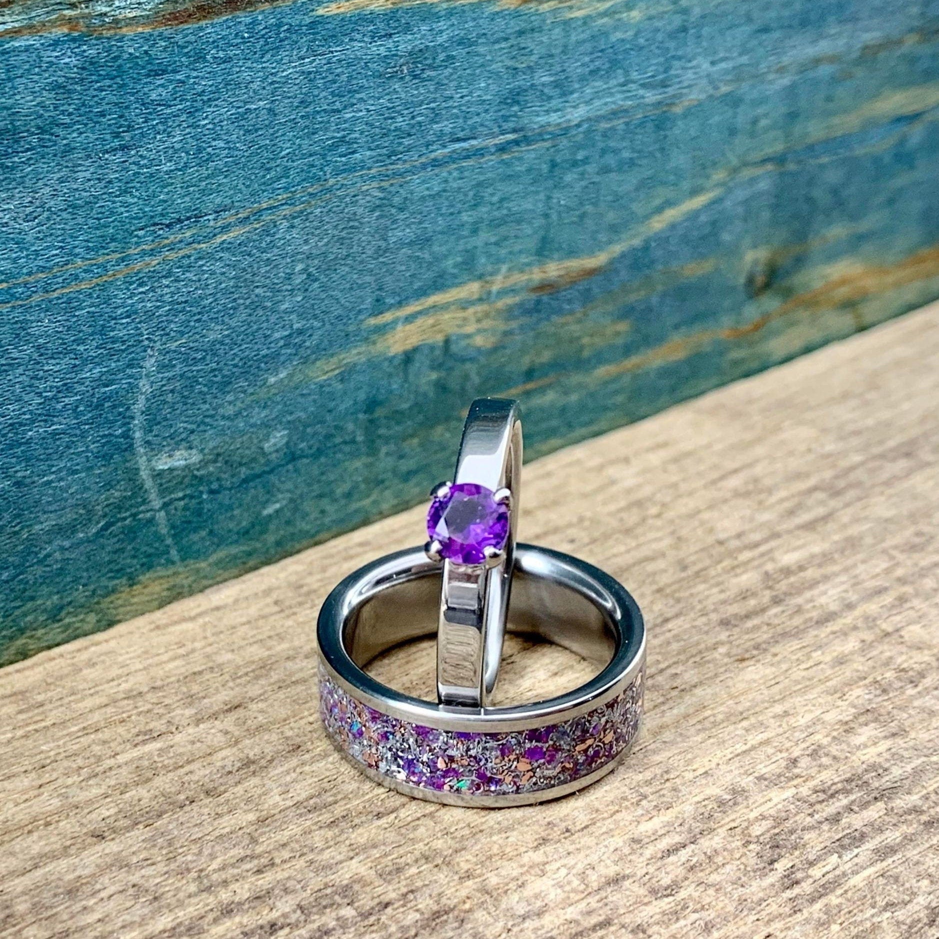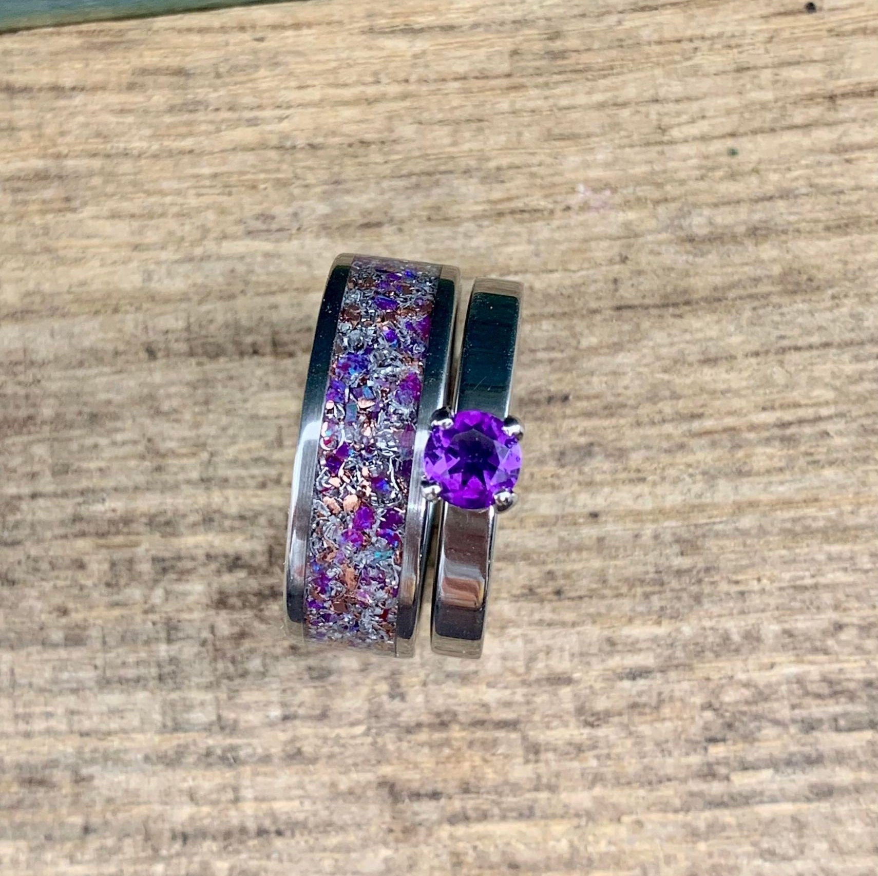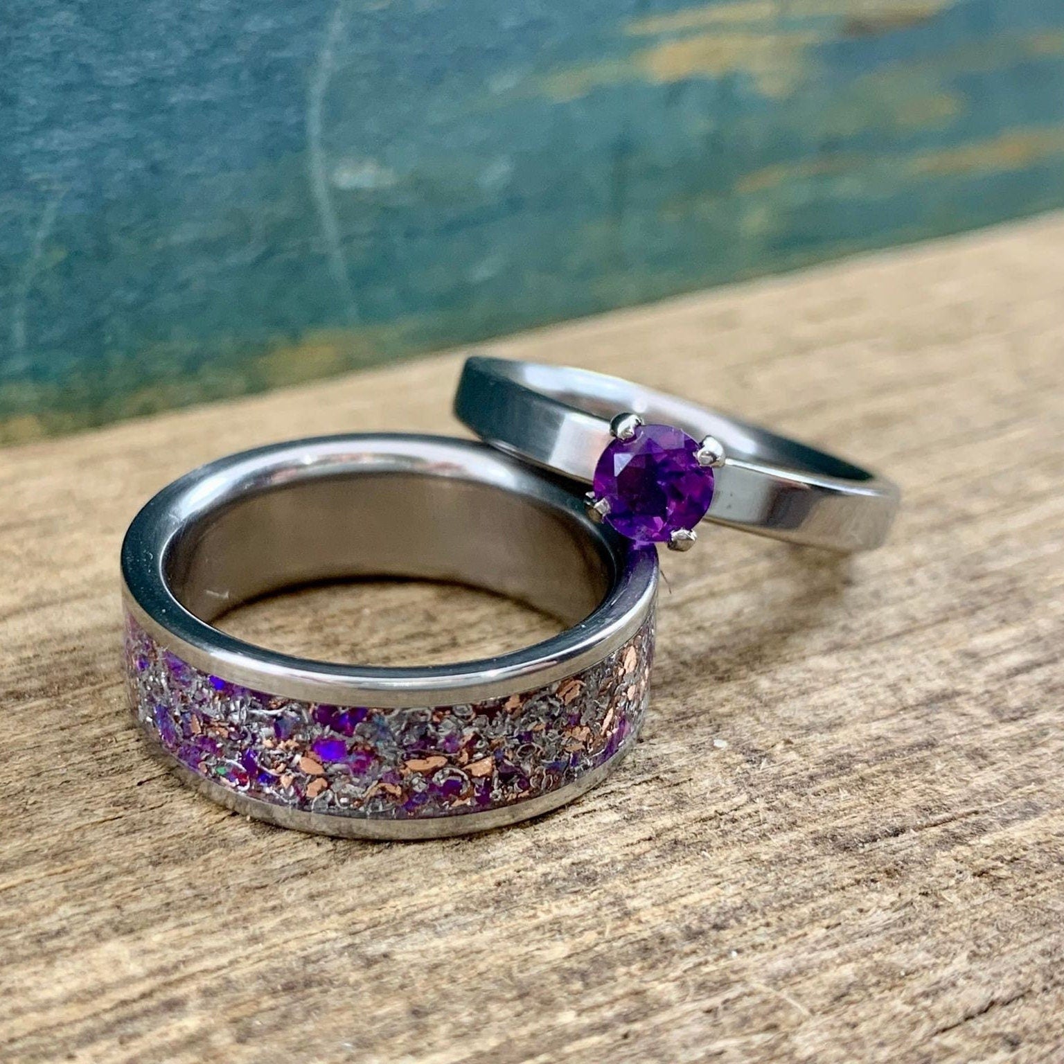 A gorgeous, made to order amethyst his and hers ring set. This stunning matching couple's wedding band set consists of two titanium rings- an engagement ring set with a 5mm stunning amethyst, and a coordinating titanium ring inlaid with a signature inlay mix- copper, aluminum, Gibeon meteorite, sugilite, amethyst, and sparkling purple lab opal. This opal and amethyst engagement ring set is versatile as well- if you're not looking for a set of coordinated couples' rings, our titanium wedding set with amethyst, opal, and meteorite makes an excellent engagement band set for her. Best of all, as with all of our rings, this set is entirely handcrafted from start to finish and is a perfect anniversary gift or alternative wedding bands set.