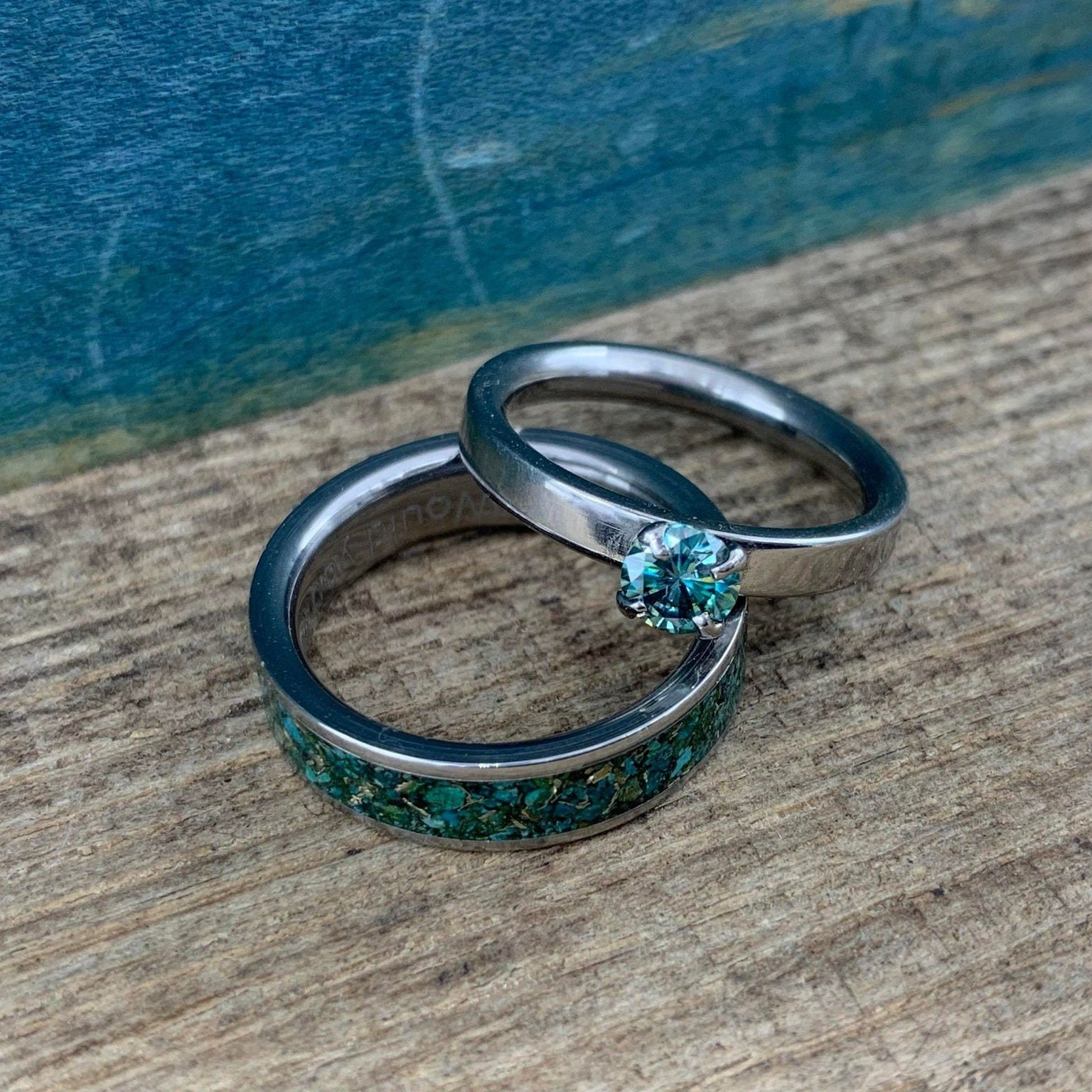 Are you in love with a hobgoblin? Or perhaps you're a frog princess (or prince?) If this describes you or someone you love, then do we have the perfect rings for you! Our Hobgoblin inlay ring is paired with one of our beautifully handcrafted engagement rings set with a gorgeous 5mm (.5 total carat weight) blue green moissanite to create this beautiful set of rings for men or women. Each ring is handmade from start to finish from aerospace titanium, so you can wear these rings with no worry about metal allergies.