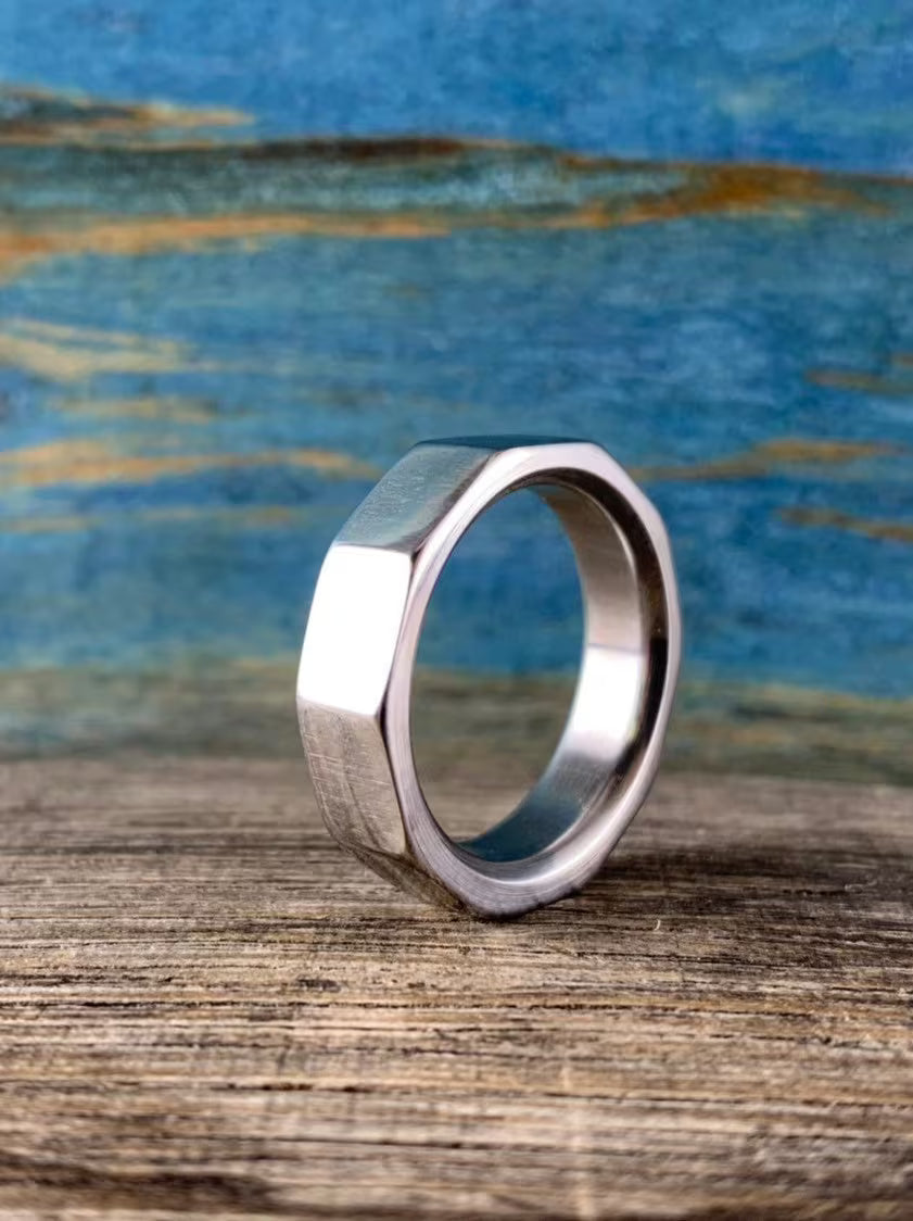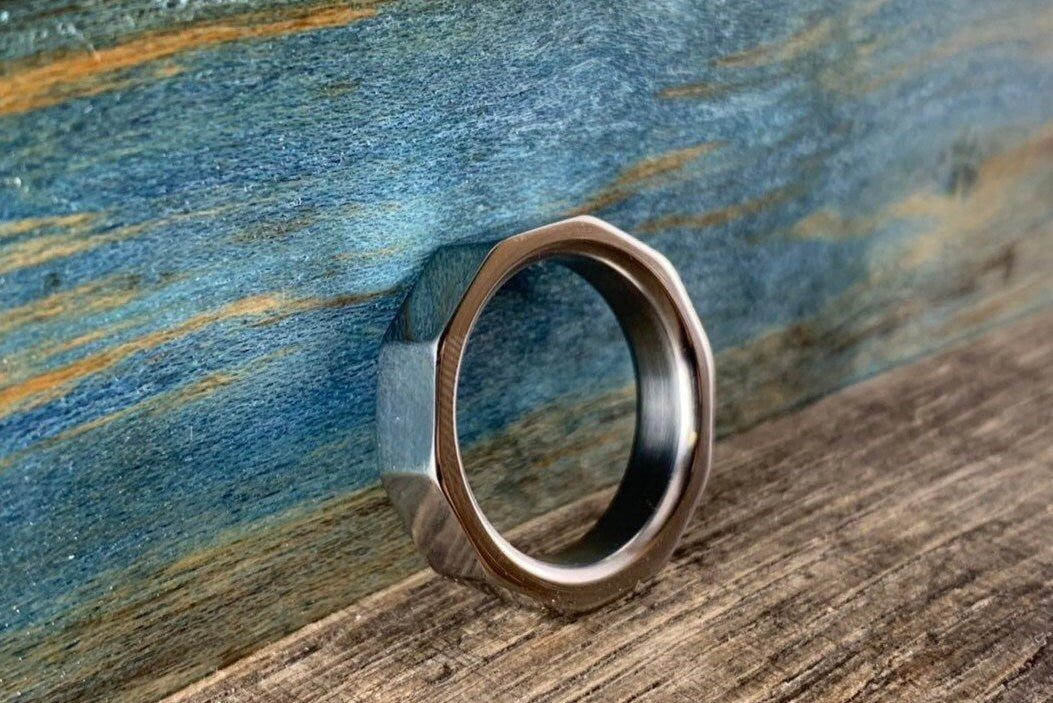Set yourself apart with the modern men's wedding band. Made from durable aerospace titanium, this handcrafted ring has ten equal sides. Sleek and classic looking, this handmade titanium ring for men is not just for weddings- it's also a perfect men's promise ring, men's engagement ring, commitment ring, anniversary gift, or everyday ring.