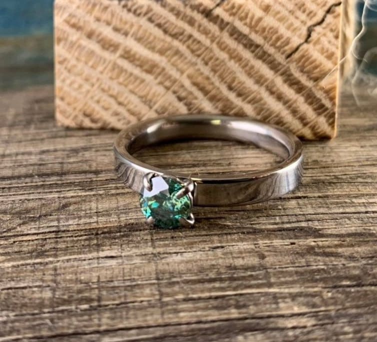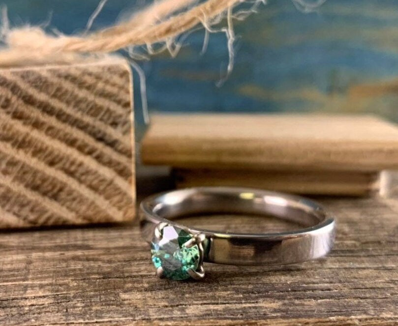 Entirely handcrafted titanium engagement ring (including the setting) with round blue green moissanite solitaire gemstone. Perfect and petite. An excellent engagement ring, wedding ring, gift for her, promise ring, anniversary ring. Comfort fit, with free engraving so that your one of a kind gift can be a truly personalized ring. Band width 2.5mm, 5mm moissanite.