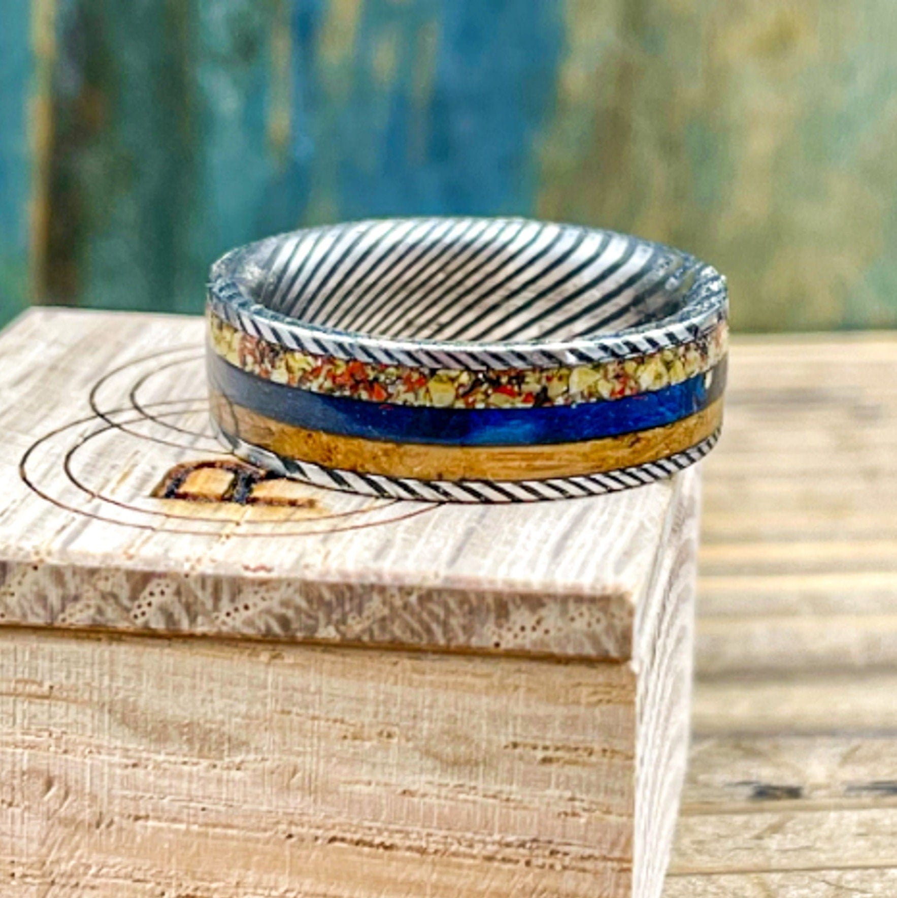 Life is too short to wear boring jewelry! Check out this beauty- a handmade stainless Damascus steel ring inlaid with dinosaur bone, antique charred oak whiskey barrel wood, and our own in house dyed blue box elder burl wood.