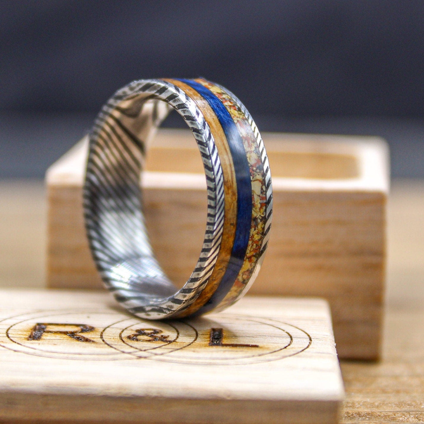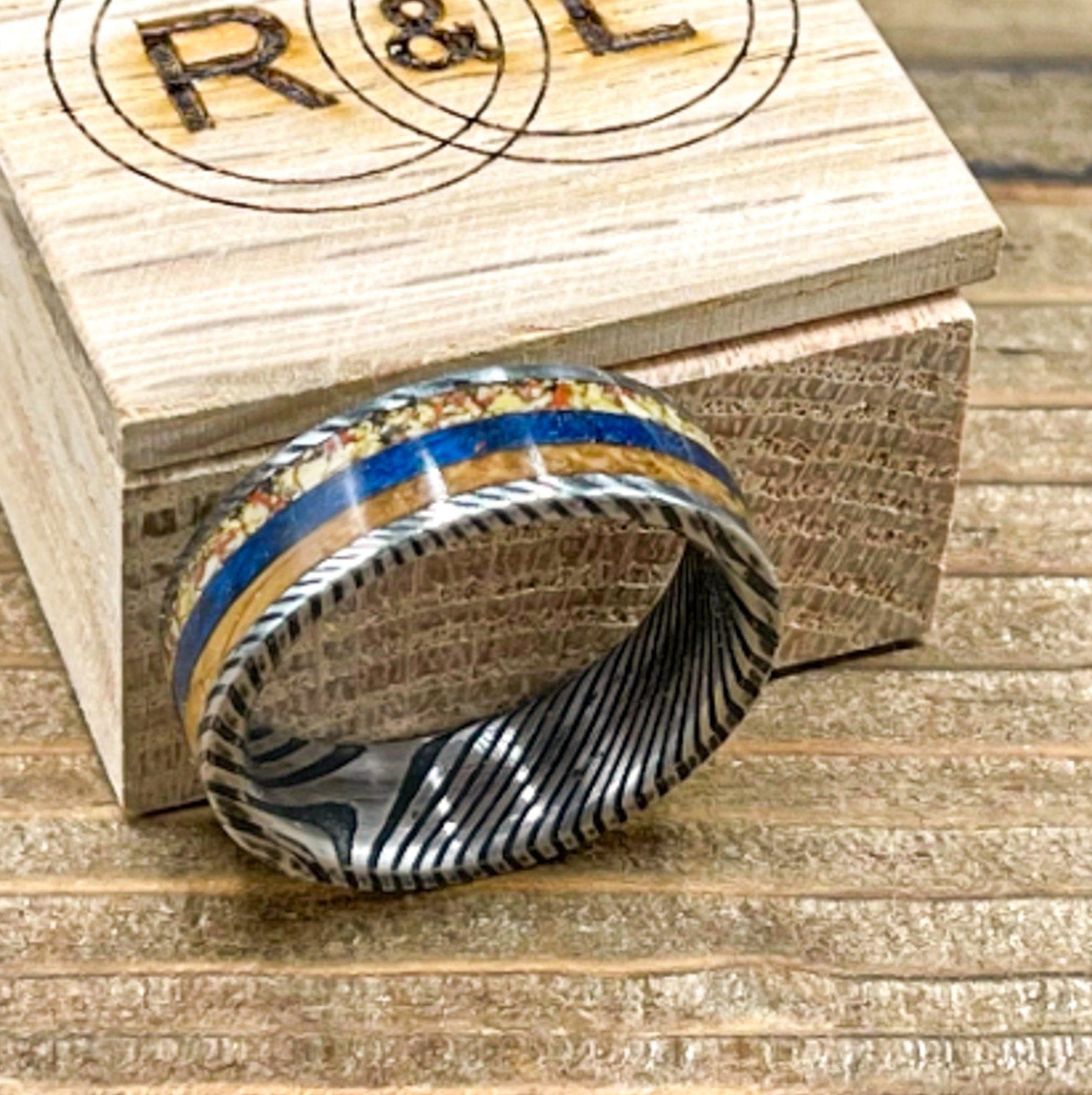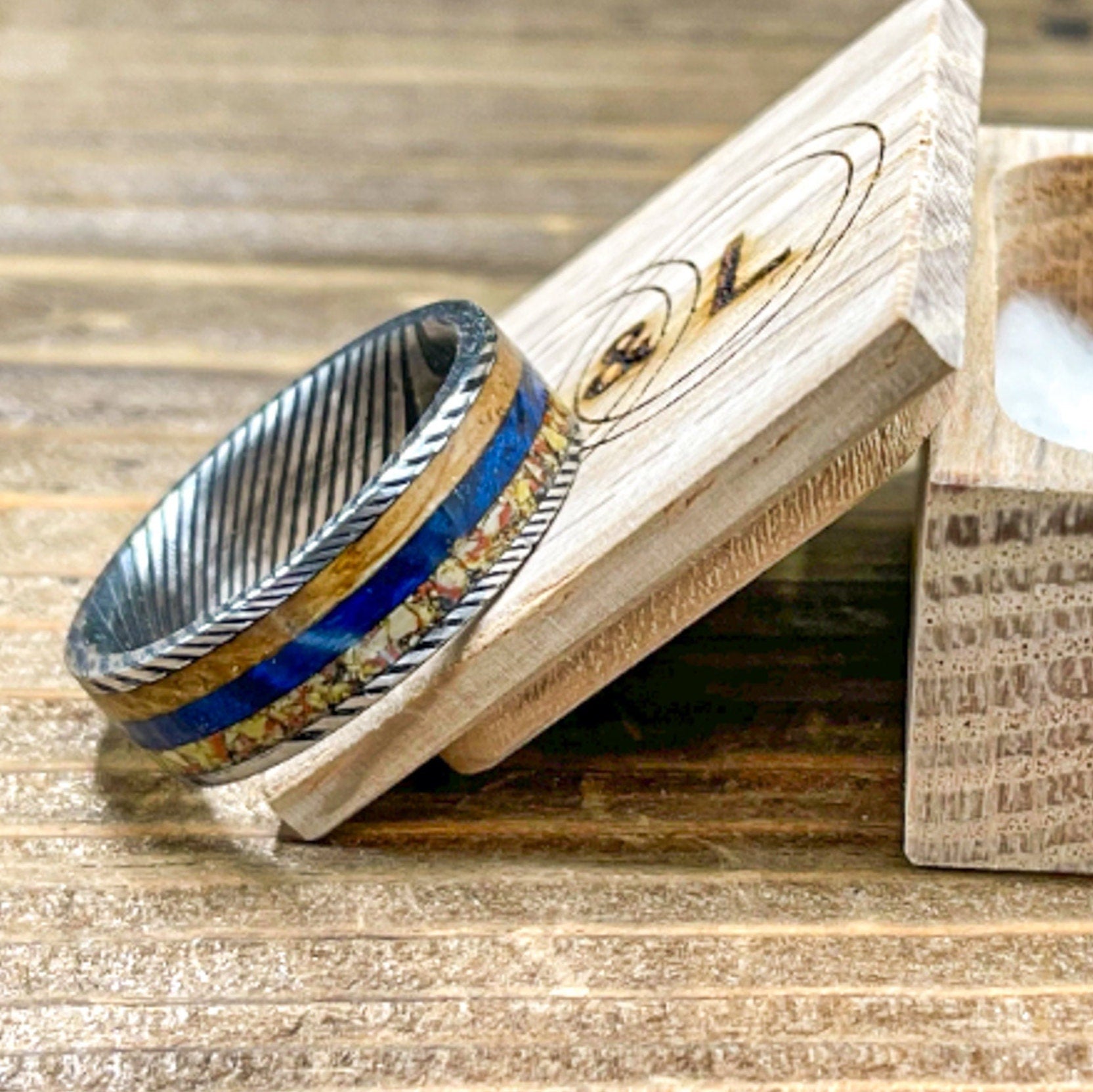 A perfect modern alternative men's wedding band or male engagement ring as well as a stunning anniversary gift, promise ring, or standout everyday ring, this custom-made Damascus steel ring with blue box elder, dinosaur bone and whiskey barrel is sure to please!