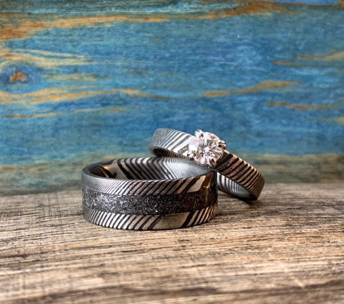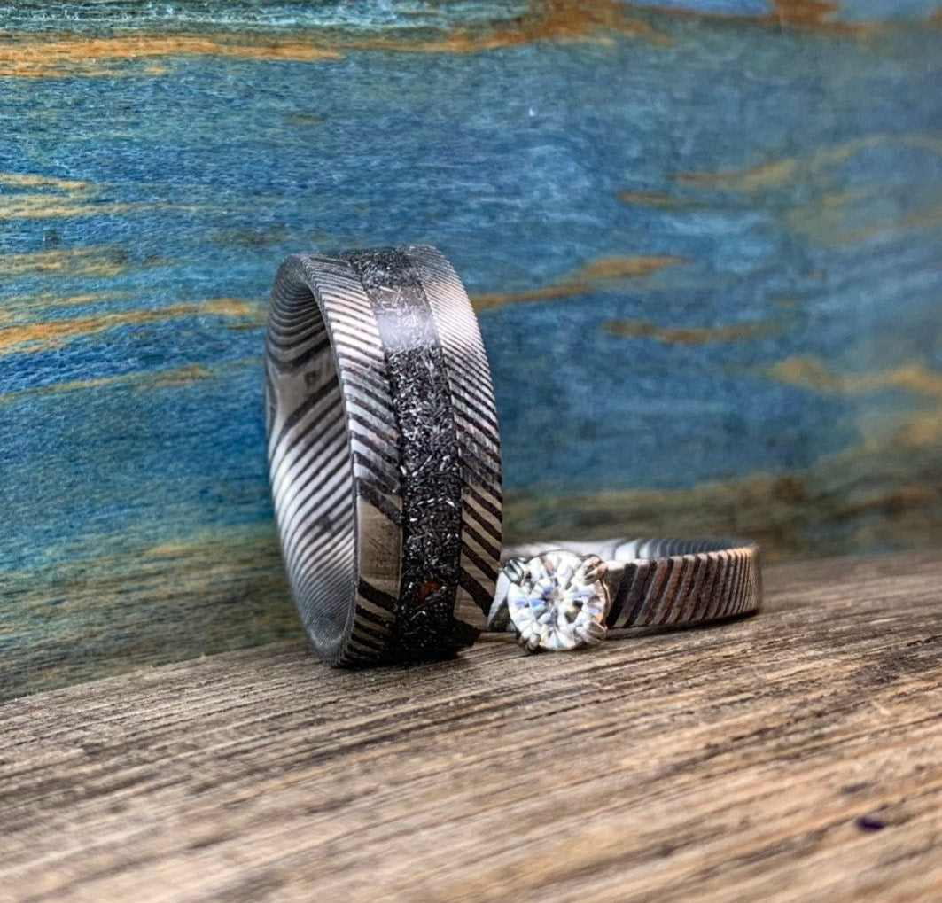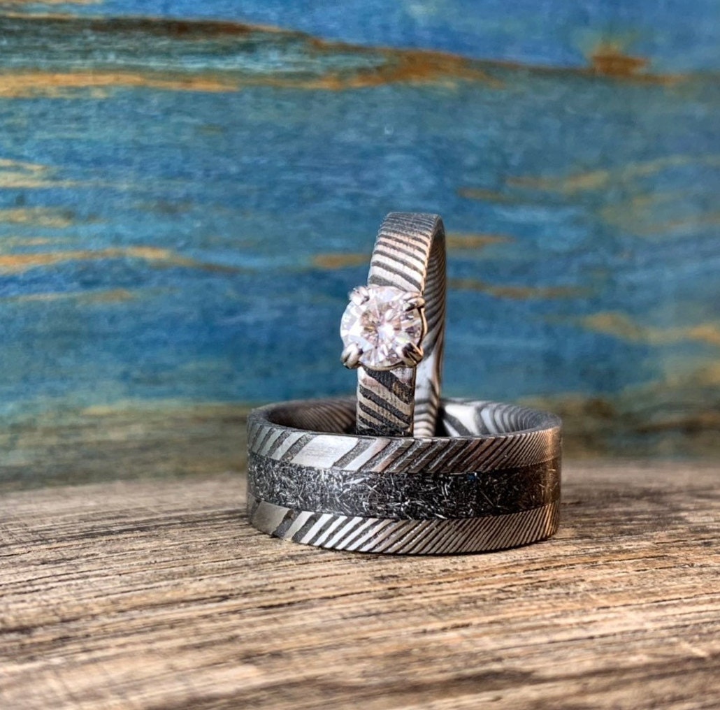 - Wedding band and engagement ring made entirely from stainless Damascus steel (including the setting) - His band inlaid with Gibeon meteorite and her band is set with a 5mm white moissanite