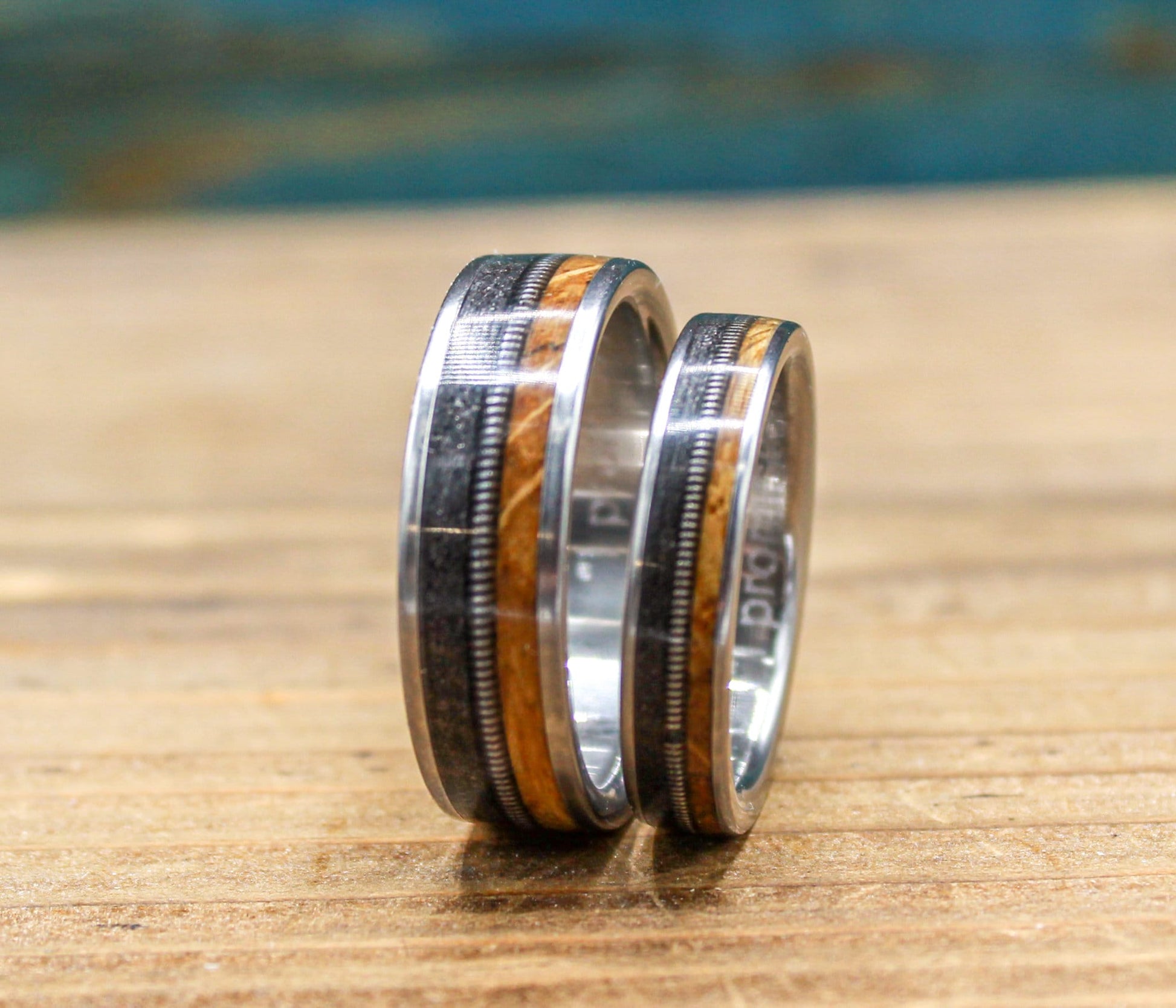 Howdy partner! Check out this fabulous handcrafted old-western inspired titanium his and hers ring set! We've paired sleek titanium with our antique charred oak whiskey barrel wood, guitar string, and a black powder inlay (we used graphite) to create a couple's ring set that's suitable for any ol' west gunslinger! It's the perfect accessory for the outlaws in your life. Our whiskey barrel wood is antique- its 40 years old, and the whiskey barrel rings we create from it are truly unique. Whatever the occasion- whether you're looking for a his and hers matching couples ring set, alternative engagement rings, promise rings, or just the perfect accessories for when you're hanging out at the saloon, these rings will certainly hit the bullseye. Best of all, like all of our rings, these wood wedding bands are entirely customizable and can be personalized with inside ring engraving, making them one of a kind.