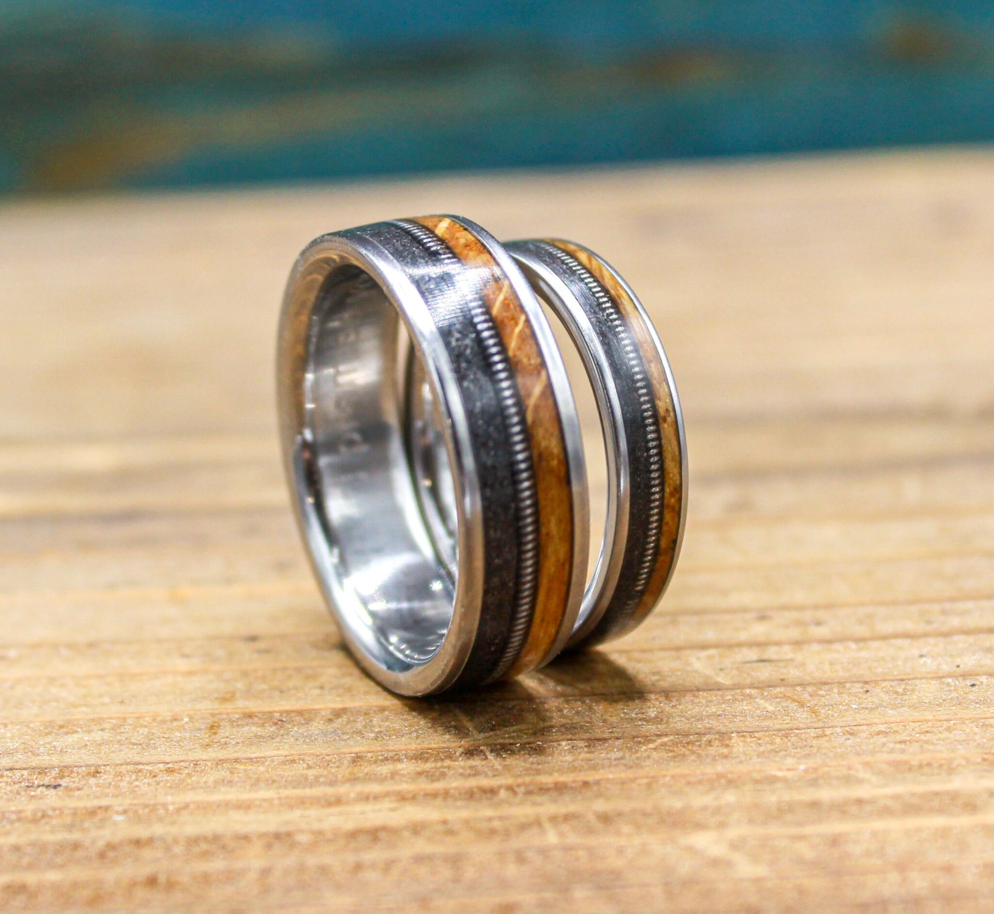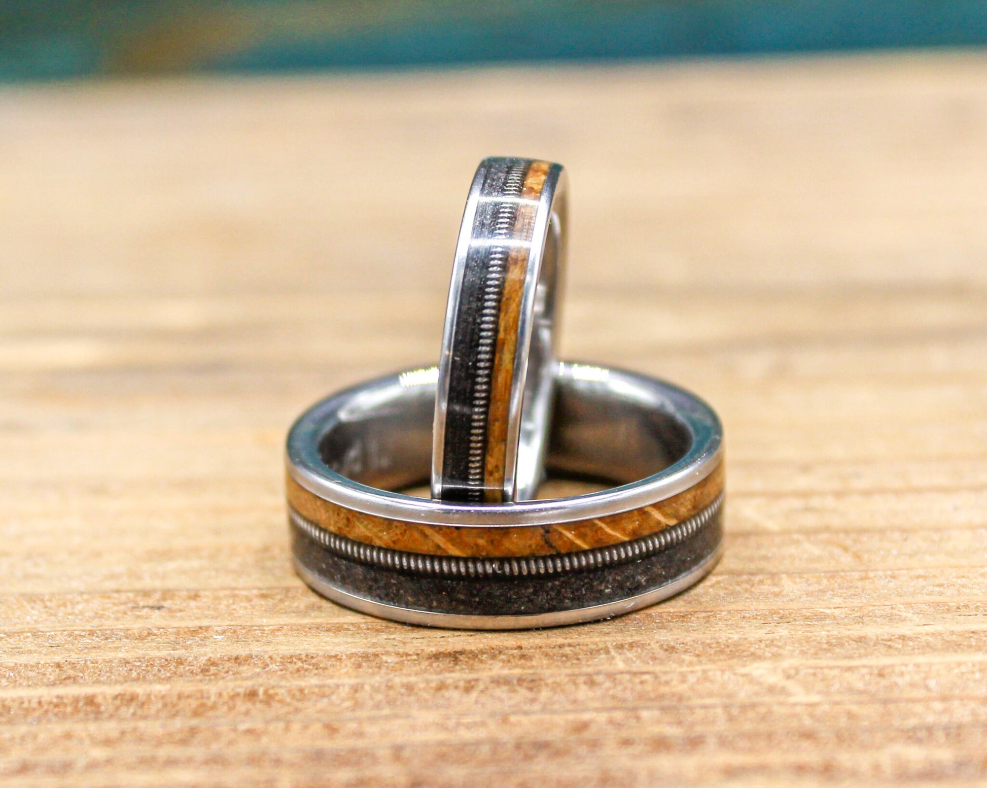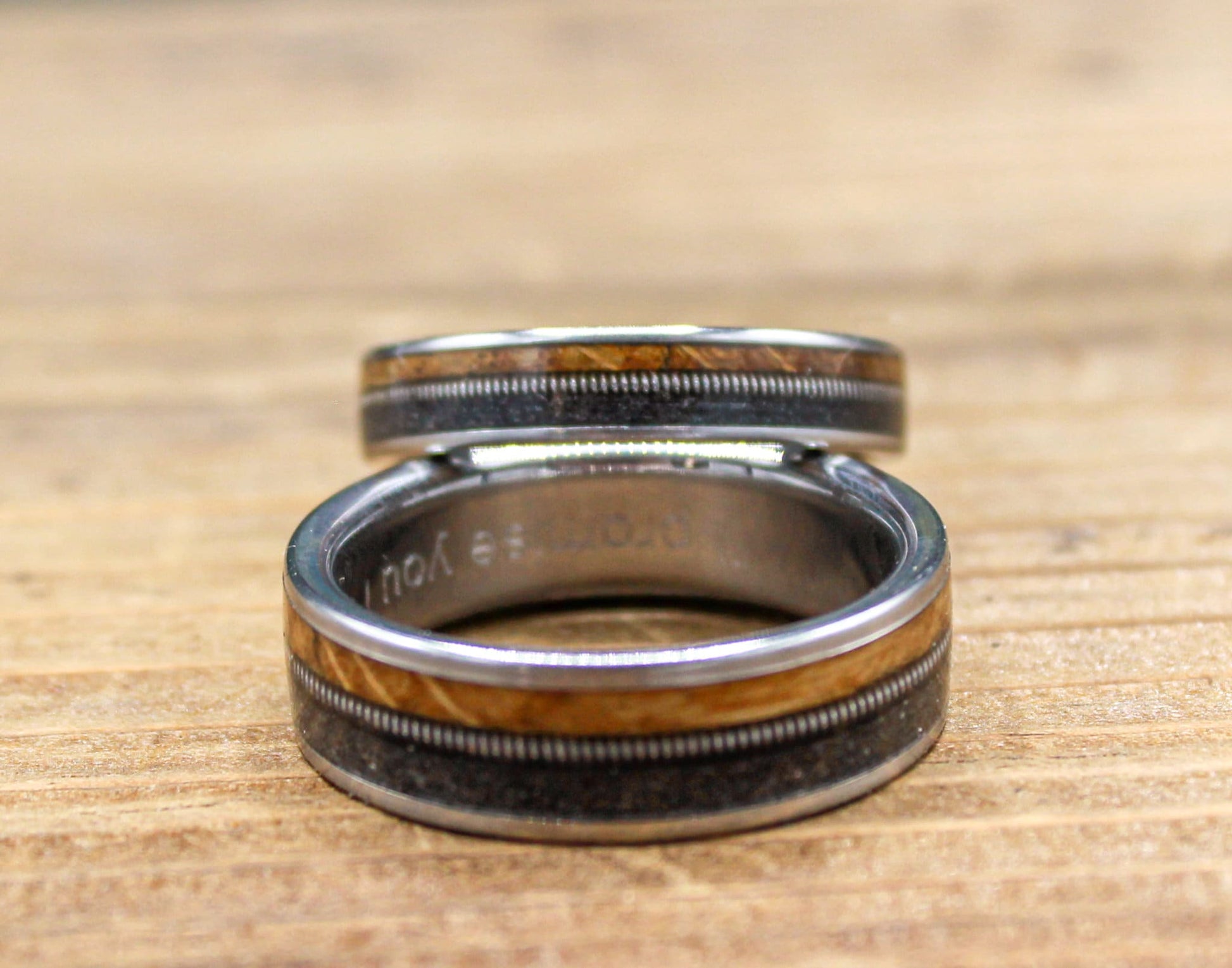 Gunslinger His and Hers Wedding Band Set - Titanium Couples Rings with Whiskey Barrel Wood and Guitar String Inlays