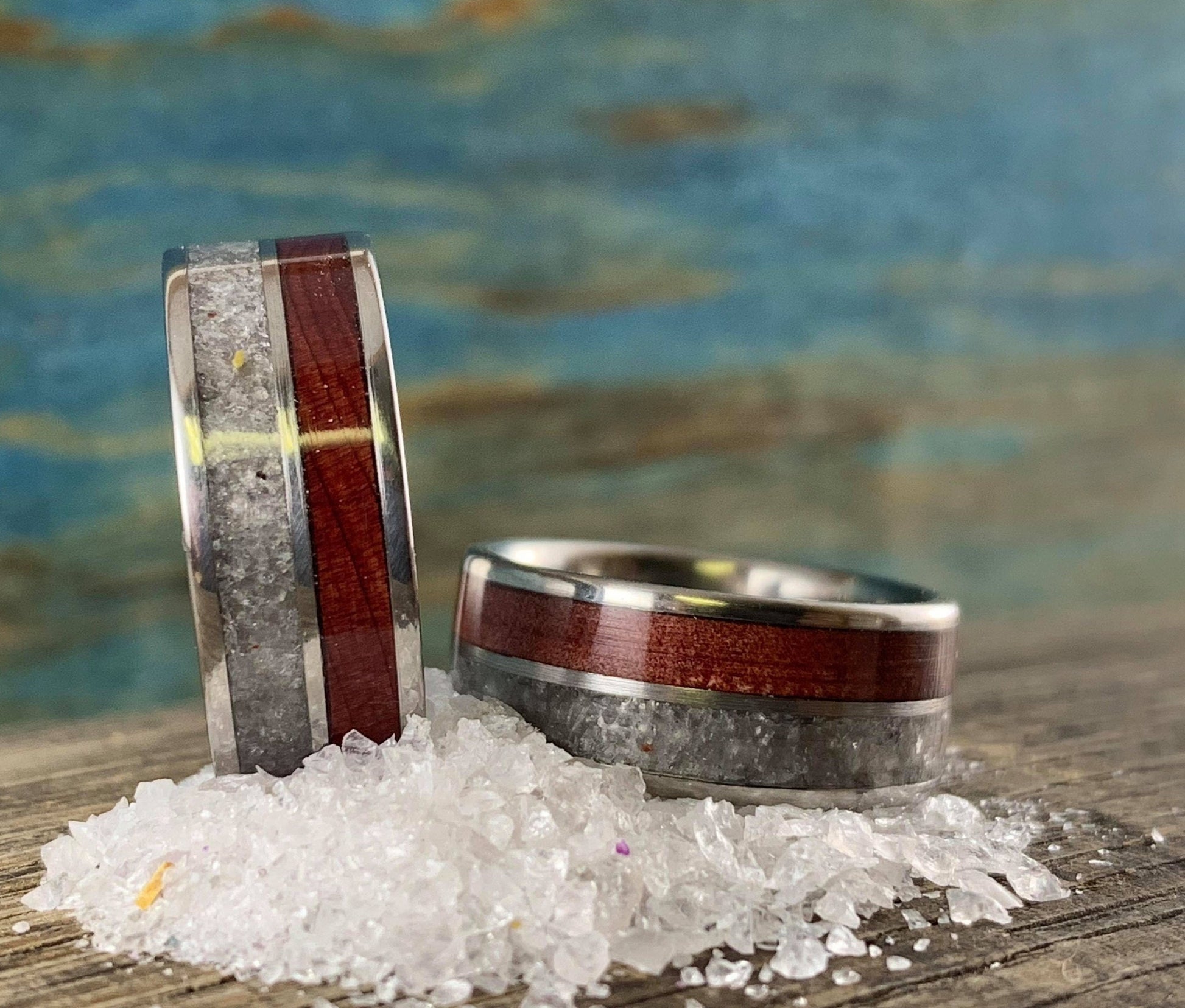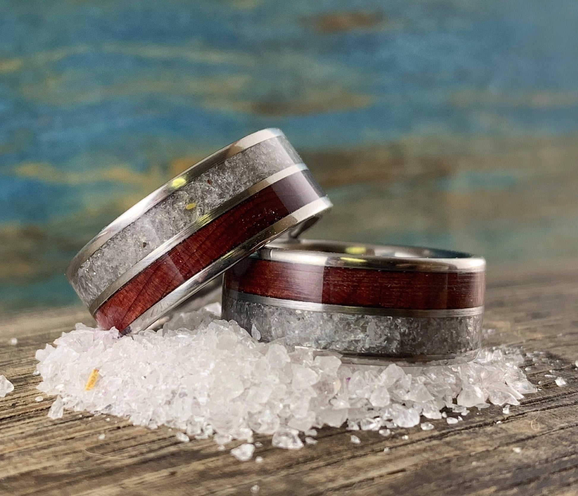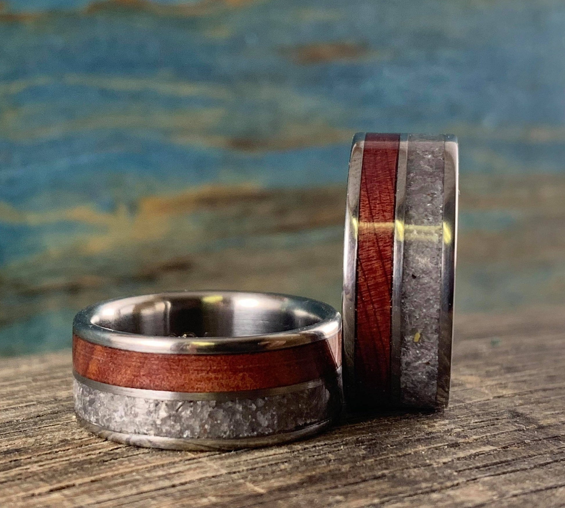 Declare your love for everyone to see with this handmade titanium, redwood and quartz wedding ring set. These custom made rings are just ~ stunning~ ! We've taken two of our handcrafted titanium bands and inlaid them with inlays of gorgeous redwood and rose quartz. We love the combination of the rich redwood and shimmering quartz separated by sleek titanium. This ring set is classy and stylish- perfect for those looking for non traditional wedding rings. As an added bonus, this custom made wedding band set is entirely customizable. Don't prefer redwood or quartz as your inlays? You can choose different wood and stone varieties. Also customizable are width and band profile. Finally, you can further customize this set with inside ring engraving of up to 20 characters per band (please limit your engraving to letters, numbers, and simple punctuation.) Contact us today and let Rings by Rob and Lean make the perfect his and hers ring set for you.