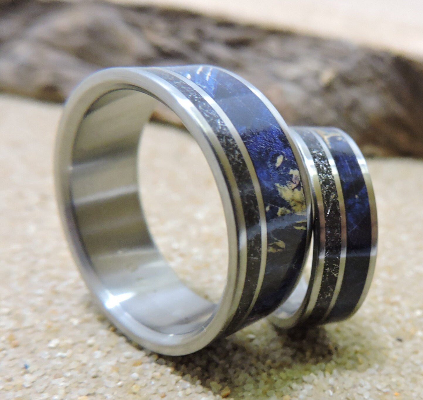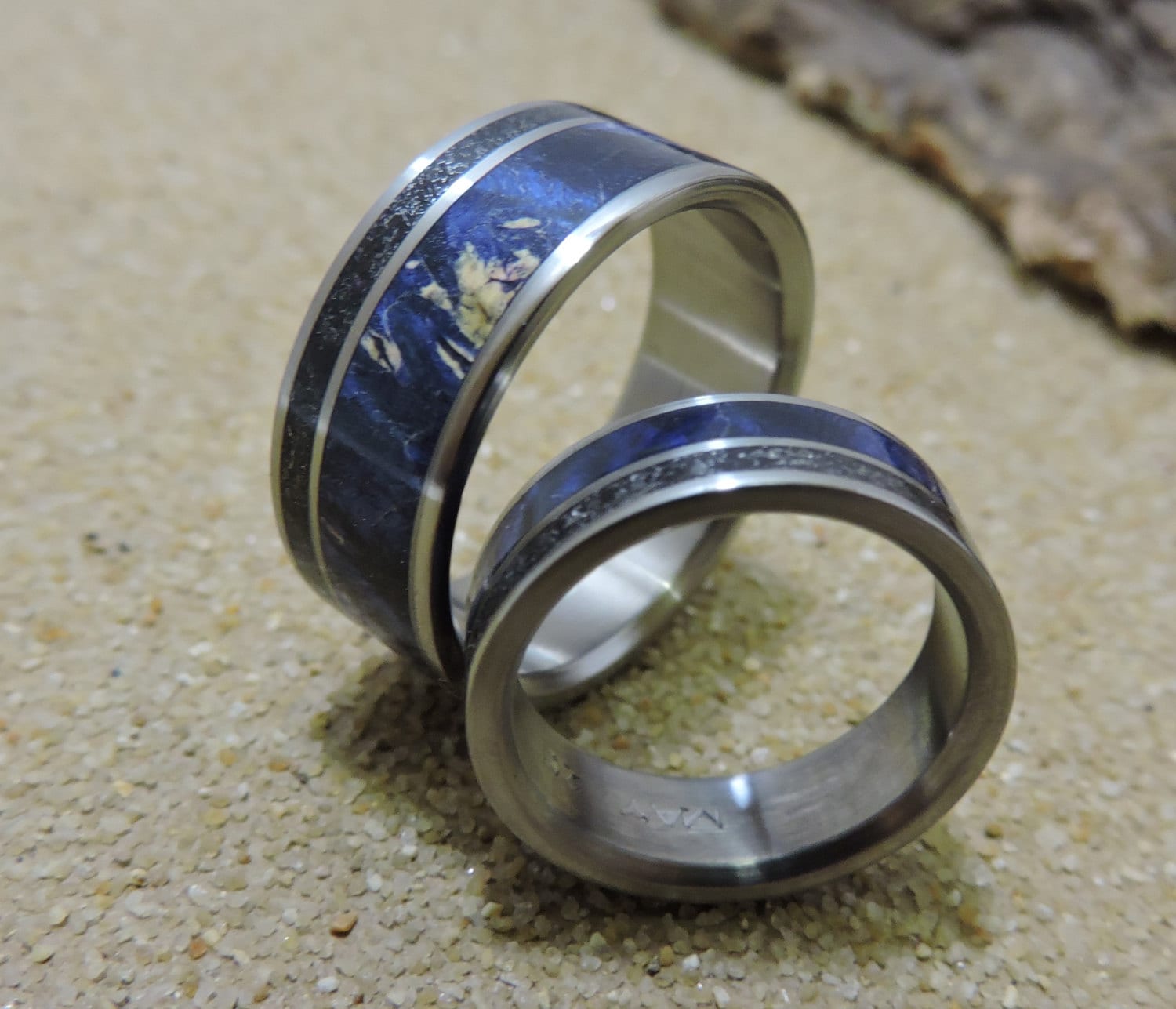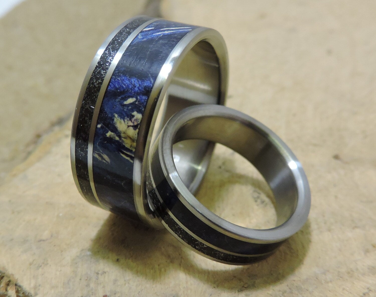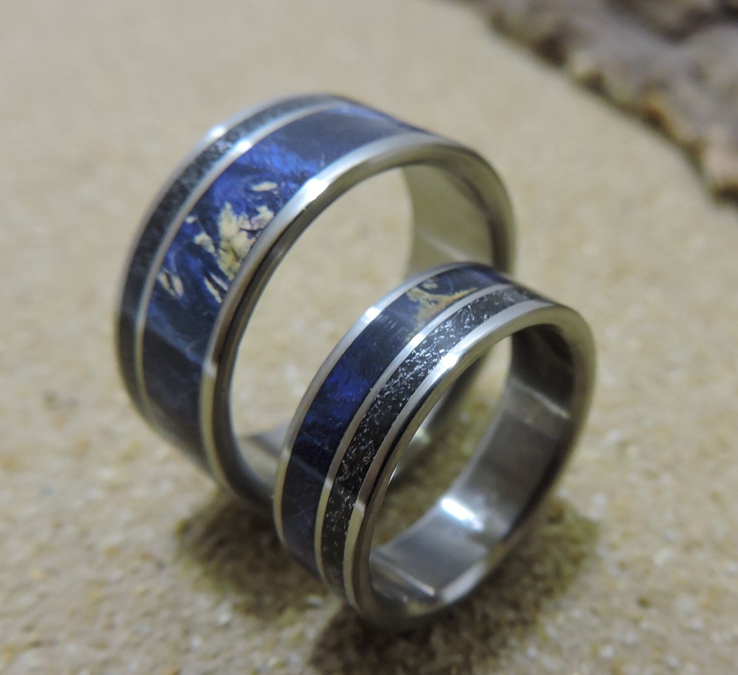 This handmade titanium ring set is absolutely stunning. These his and hers rings are inlaid with meteorite and gorgeous blue box elder burl wood. We love the unique look of these meteorite rings! They make a perfect his and hers ring set. This titanium ring set can be engraved (up to 20 characters per band. Also, limit your engraving to letters, numbers, and simple punctuation.) Not looking for titanium wedding rings? This meteorite and wood ring set also make an excellent choice for promise rings or anniversary rings.