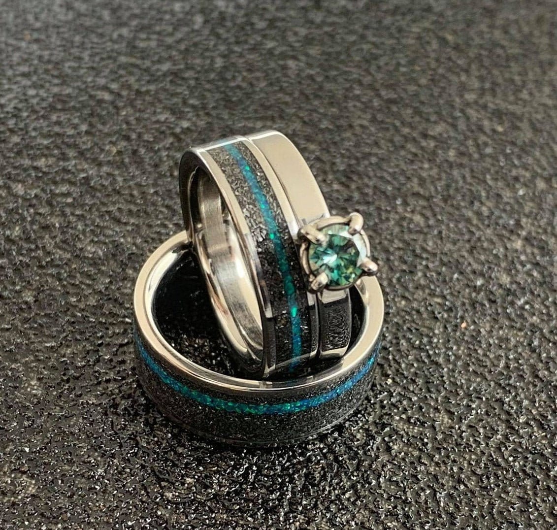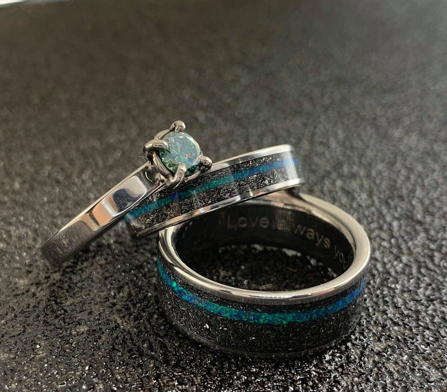 His and Hers Wedding Band Set - Matching Titanium Wedding Bands with Meteorite, Opal and Moissanite - Engagement Ring
