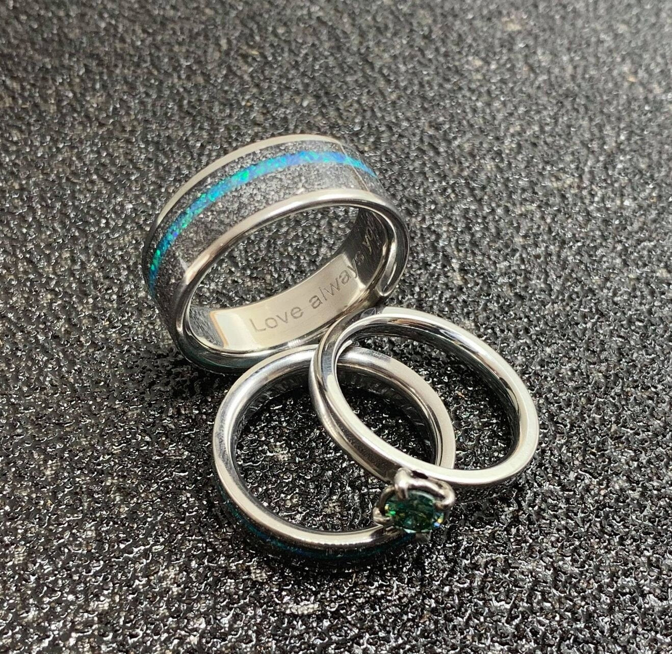 Display your love for all to see with this stunning his and hers titanium wedding band set. Three handcrafted titanium rings make up the custom-made matching set- in his ring, a thin band of dazzling blue green lab opal stands out against the deep gray of a meteorite inlay; in hers, one feminine band echoes his ring, while in the other, we've set a gorgeous 5mm (.5 total carat weight) blue green moissanite. Each ring is handmade from start to finish from titanium, so you can wear these rings with no worry about metal allergies. Whether you're getting married for the first time or if you're celebrating a milestone anniversary, this custom-made wedding band set is sure to catch the attention of everyone who sees them. Did you know that every ring we make is custom made to order, so you can design your own one of a kind wedding band set? Also, personalize your titanium rings even more with custom engraving of up to 20 characters. Contact us to create your unique set of matching his and hers rings today.