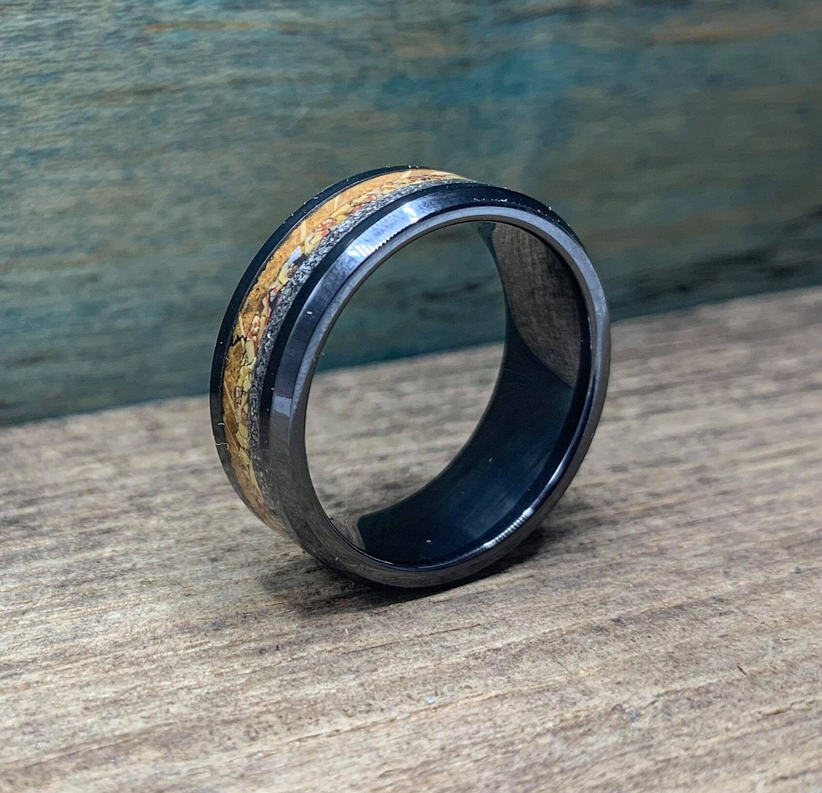Men's Meteorite Wedding Band - Black Ceramic Ring with Meteorite, Dinosaur Bone and Whiskey Barrel Wood for Men