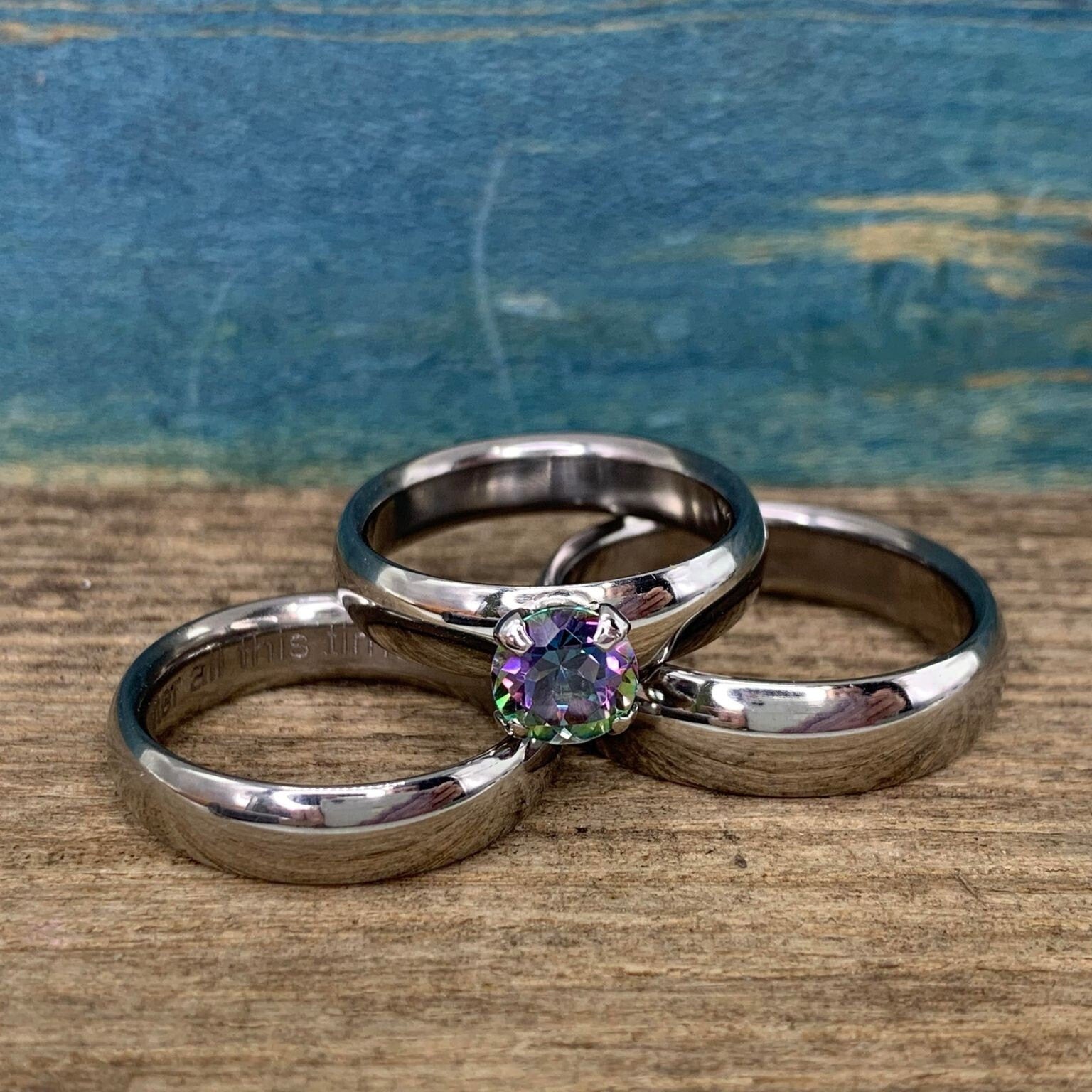 Flashes of purple, hints of sparkling green- is there any other gemstone that's more eye catching than mystic topaz? We've paired a dazzling mystic topaz engagement ring with handmade titanium wedding bands to create this standout his and hers wedding and engagement rings set.