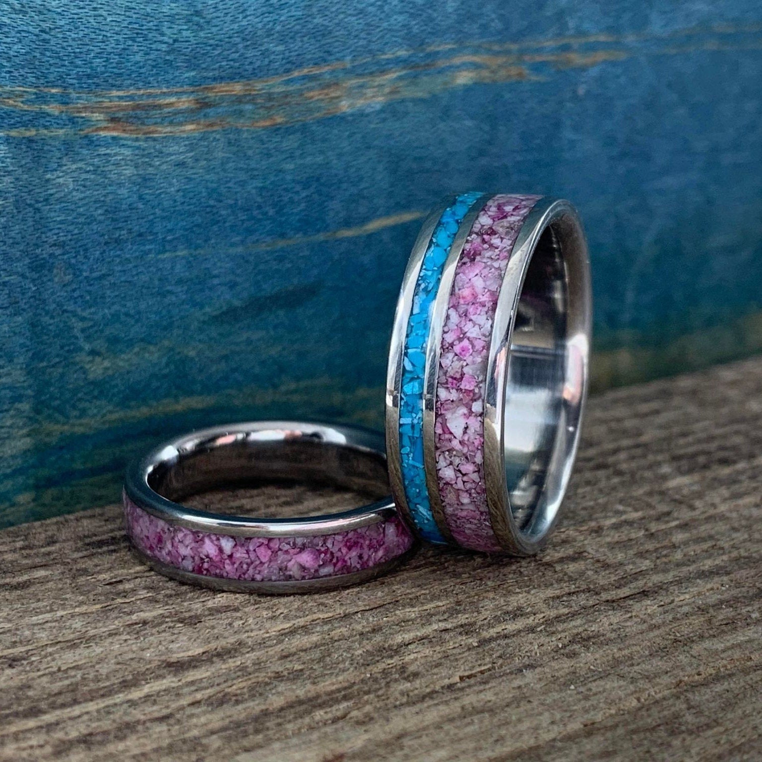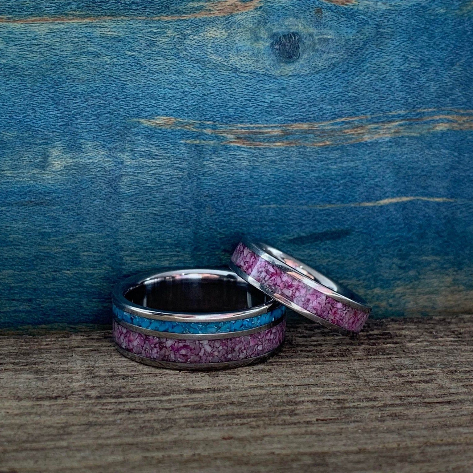 We are in LOVE with these purple and blue rings- they remind us of a lovely beach sunset. Whatever the occasion, our versatile and colorful titanium rings set with sugilite and turquoise will certainly suit your needs. They make a perfect set of wedding rings for men and women as well as wonderful non-traditional engagement rings, promise rings, anniversary rings, and more.