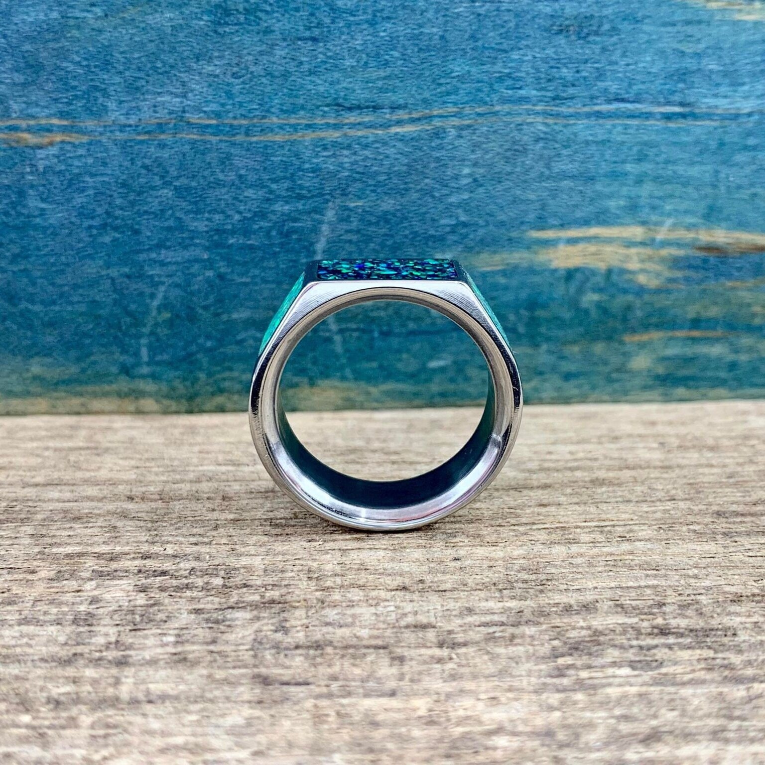 Introducing the Odhrán - a men's green opal signet ring made from titanium and vibrant green lab opal! A single inlay of darker forest green opal is flanked by two inlays of lighter green opal in this gorgeous men's ring.