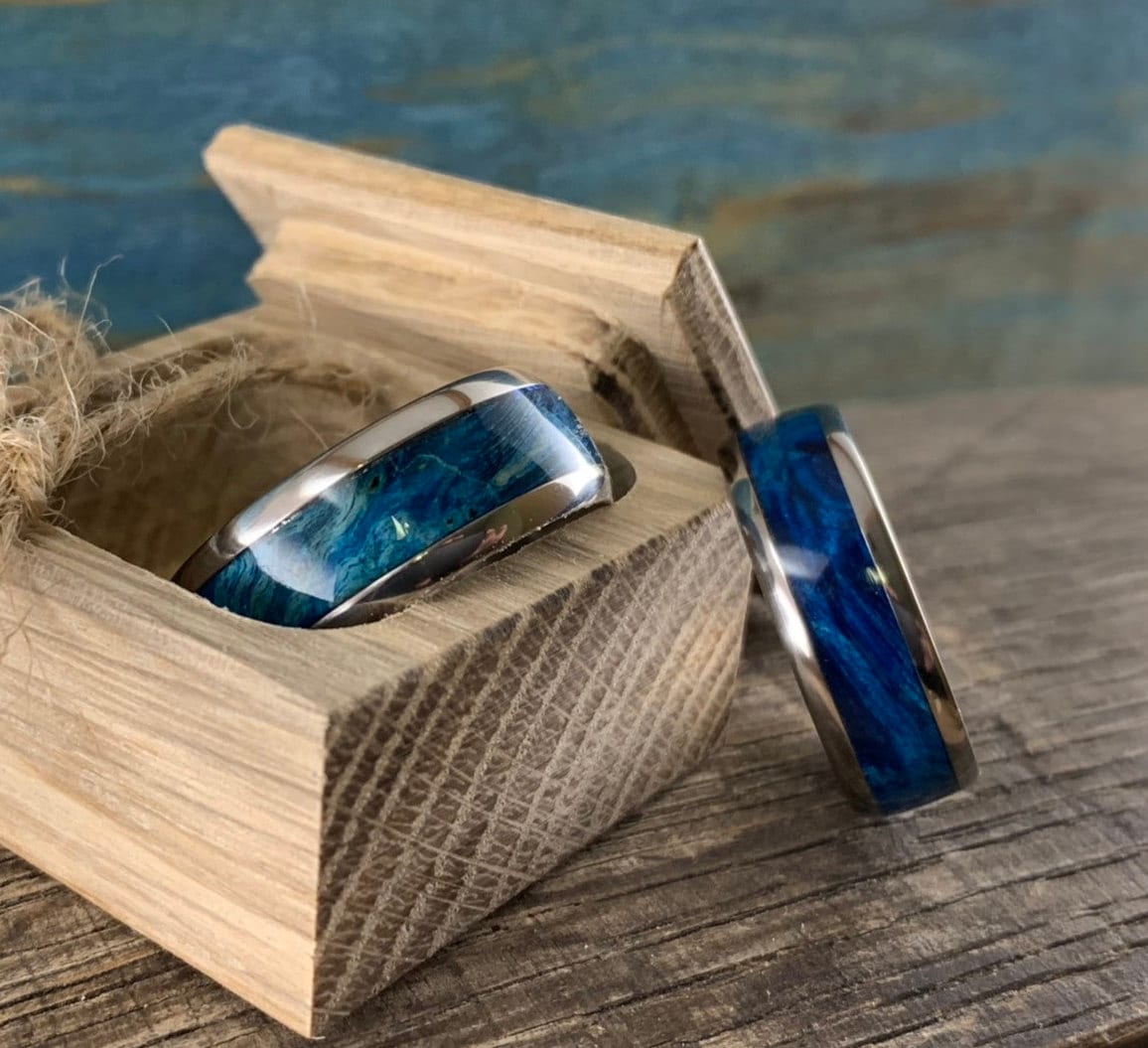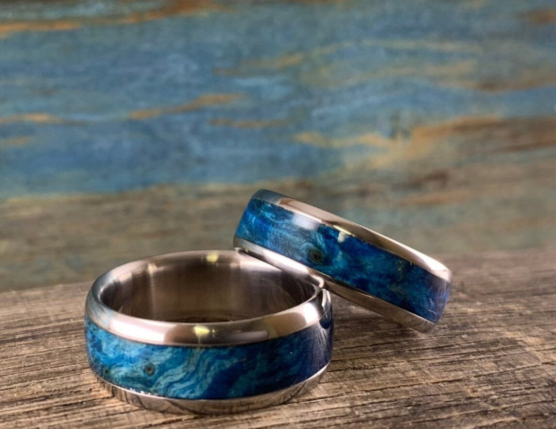 Whether you're in the market for custom made titanium and wood wedding bands, anniversary rings, friendship rings, or a gift "just because", this fantastic set for him and her is the perfect symbol of commitment. These eco friendly titanium rings with dyed blue box elder wood inlays are the epitome of refined elegance.