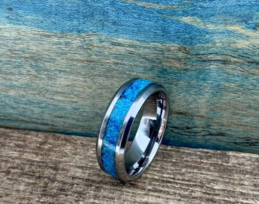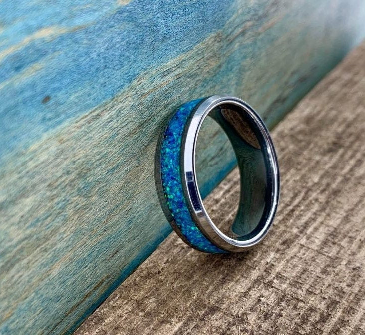 This gorgeous blue green opal ring consists of a rugged tungsten carbide band inlaid with blue green lab opal. A truly stunning and unique ring for that special man! If you're searching for a distinctive gift, then look no further- this opal ring makes a wonderful wedding band, men's engagement ring, promise ring, or anniversary gift. Prefer a different metal like titanium? Just let us know= we are happy to customize. Also, this tungsten carbide and blue opal ring would also make a great ladies' band as well- contact us for a custom-made set of matching his and hers rings!