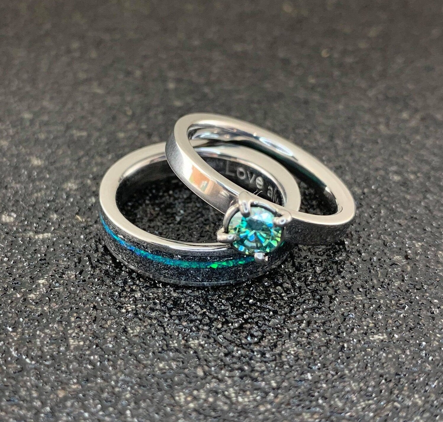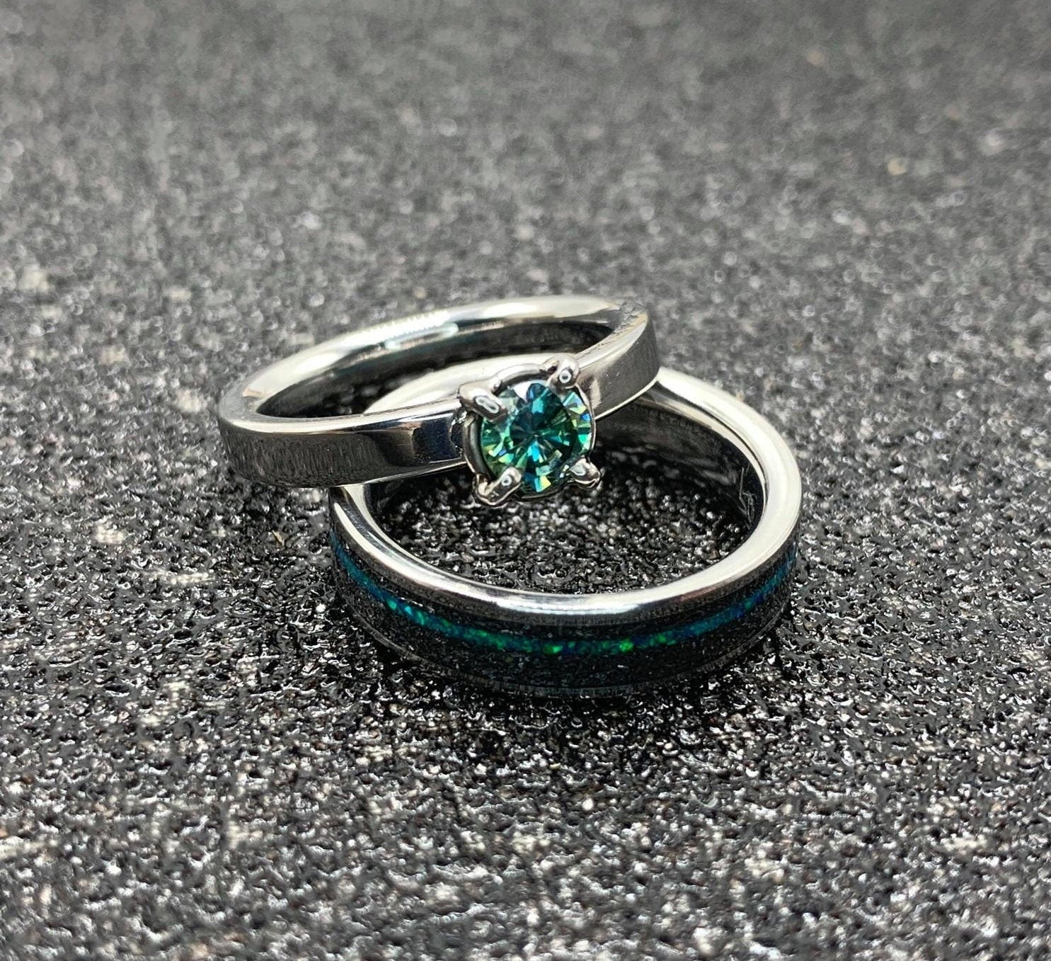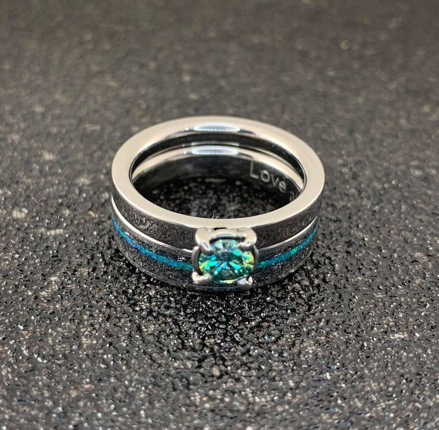 Meteorite Blue Opal Wedding Band Set and a Blue Green Moissanite Engagement Ring
