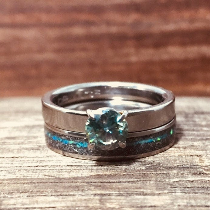 Celebrate your love with this stunning titanium wedding band set for her! Two titanium rings make up the custom made matching set- a gorgeous wedding band for her, made with a deep gray inlay of certified Gibeon meteorite and a thin offset inlay of bright blue green opal ; and the engagement ring, we've set a gorgeous 5mm (.5 total carat weight) blue green moissanite in a hand made titanium prong setting! Whether you're getting married for the first time or if you're celebrating a milestone anniversary, this custom made wedding band set is sure to catch the attention of everyone who sees them!