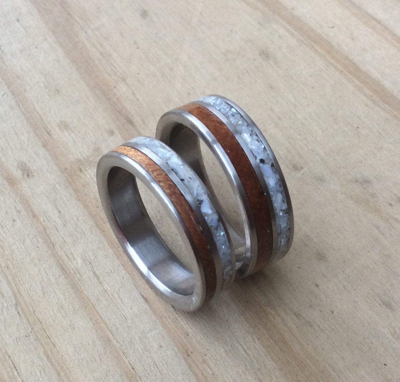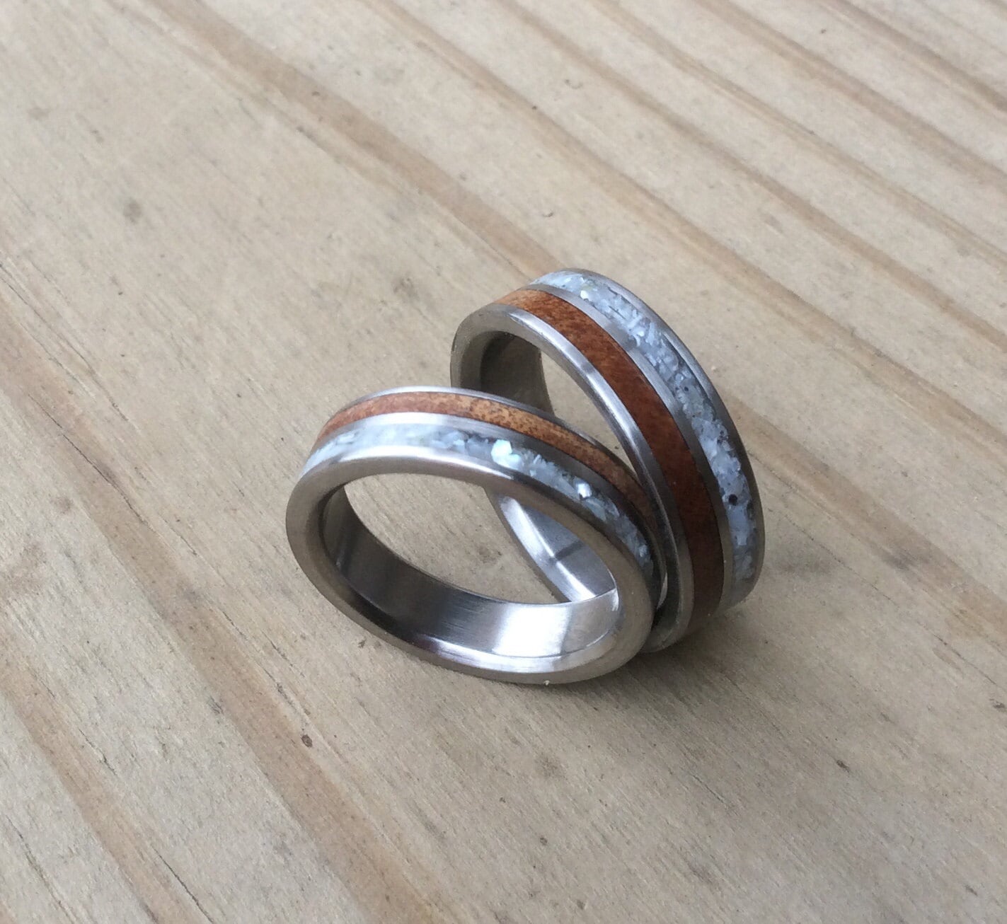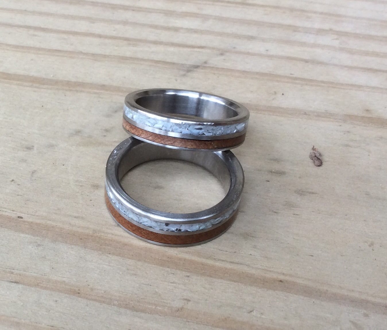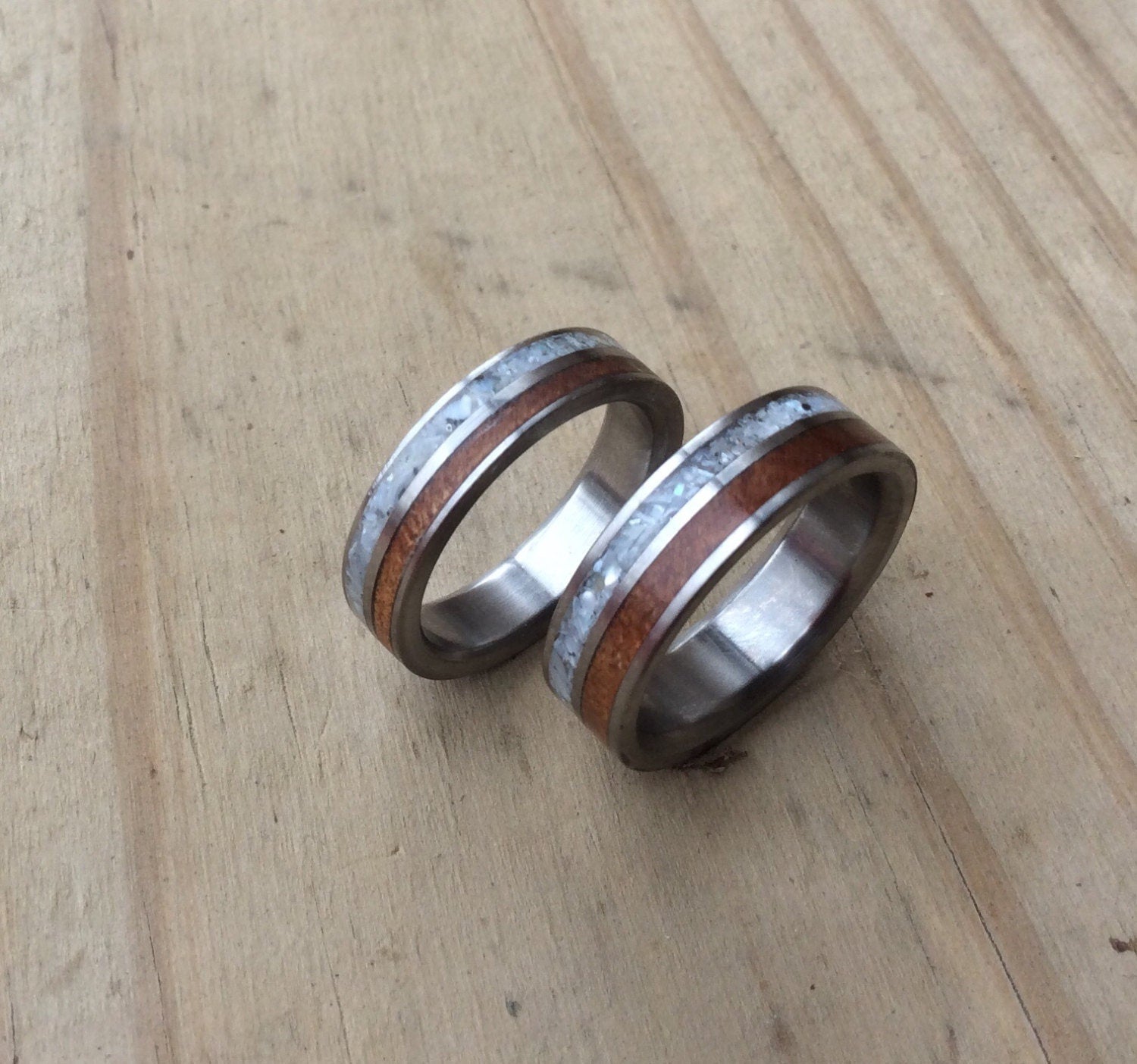 This handmade titanium ring set is just stunning. These rings are inlaid with gorgeous ancient kauri wood (50,000 plus years old!) and mother of pearl. The wood and mother of pearl look great together! This wood ring set with mother of pearl is a great his and hers ring set. This ring set can be engraved on the inside (twenty character limit, please. Also, limit your engraving to letters, numbers, and simple punctuation.) Not looking for a titanium wedding band set? This kauri and mother of pearl set is excellent as a set of promise rings or anniversary rings.