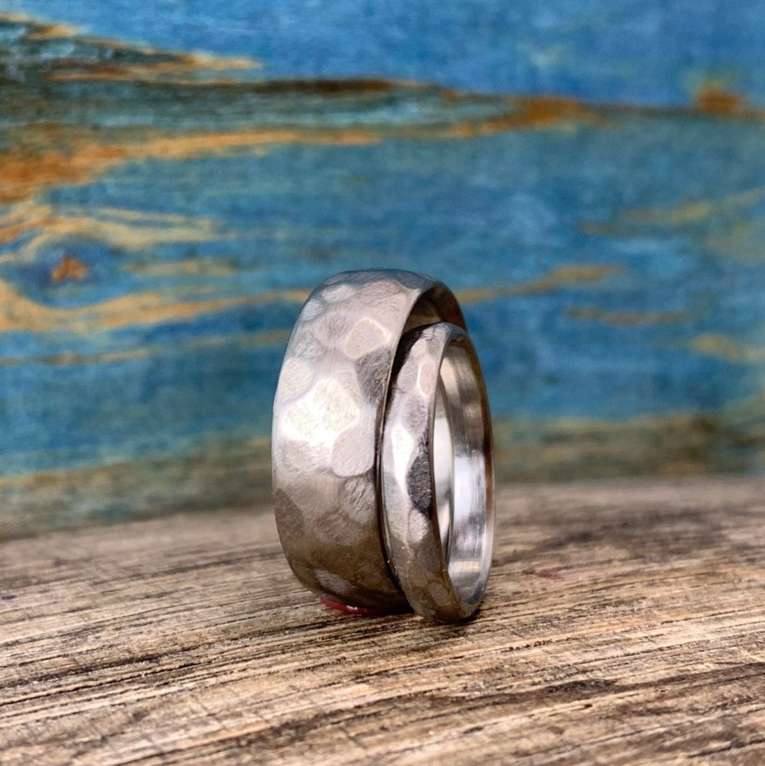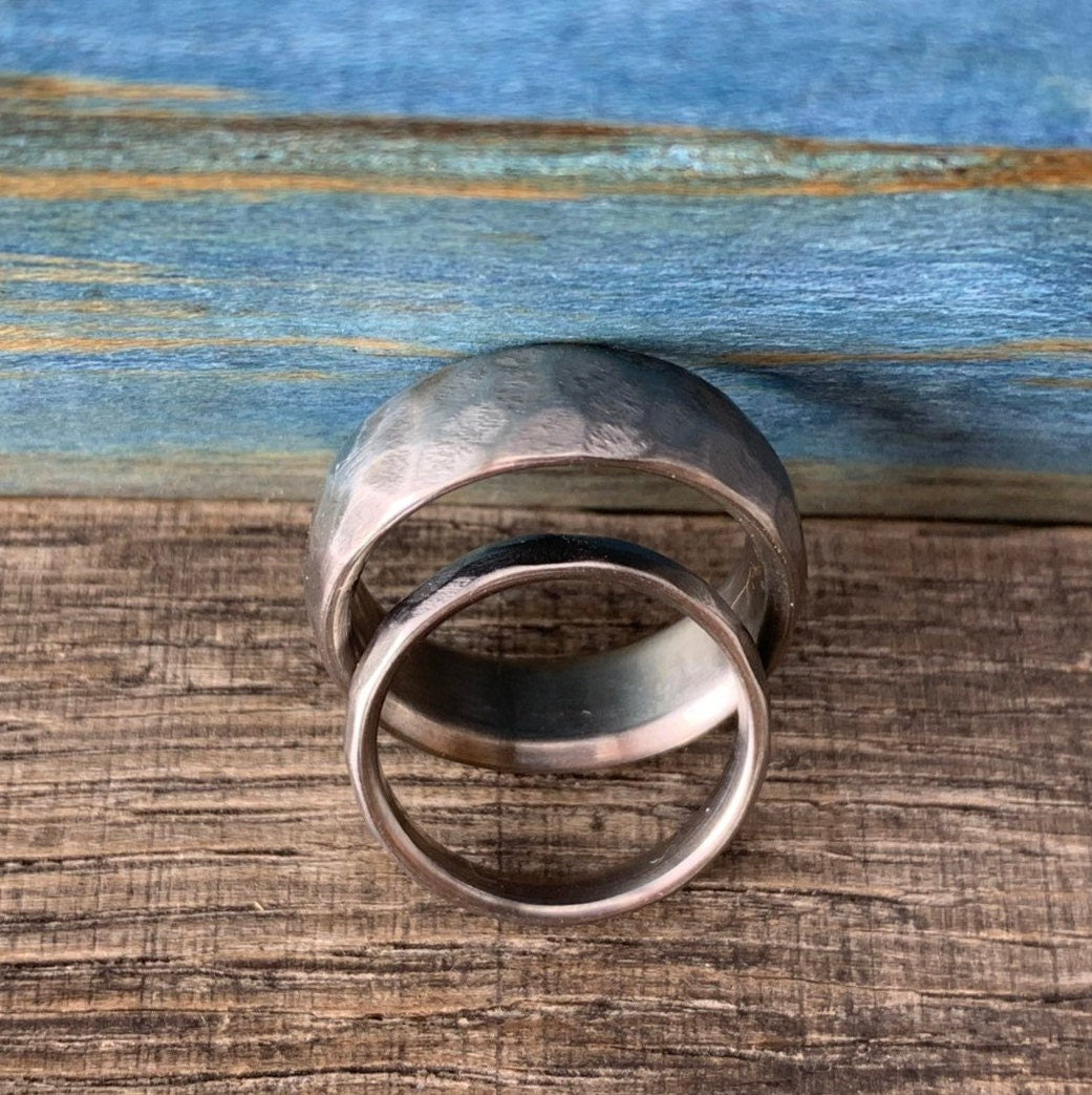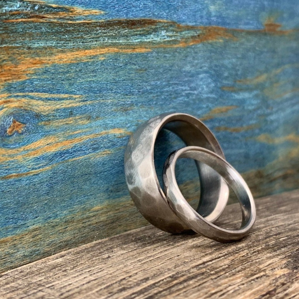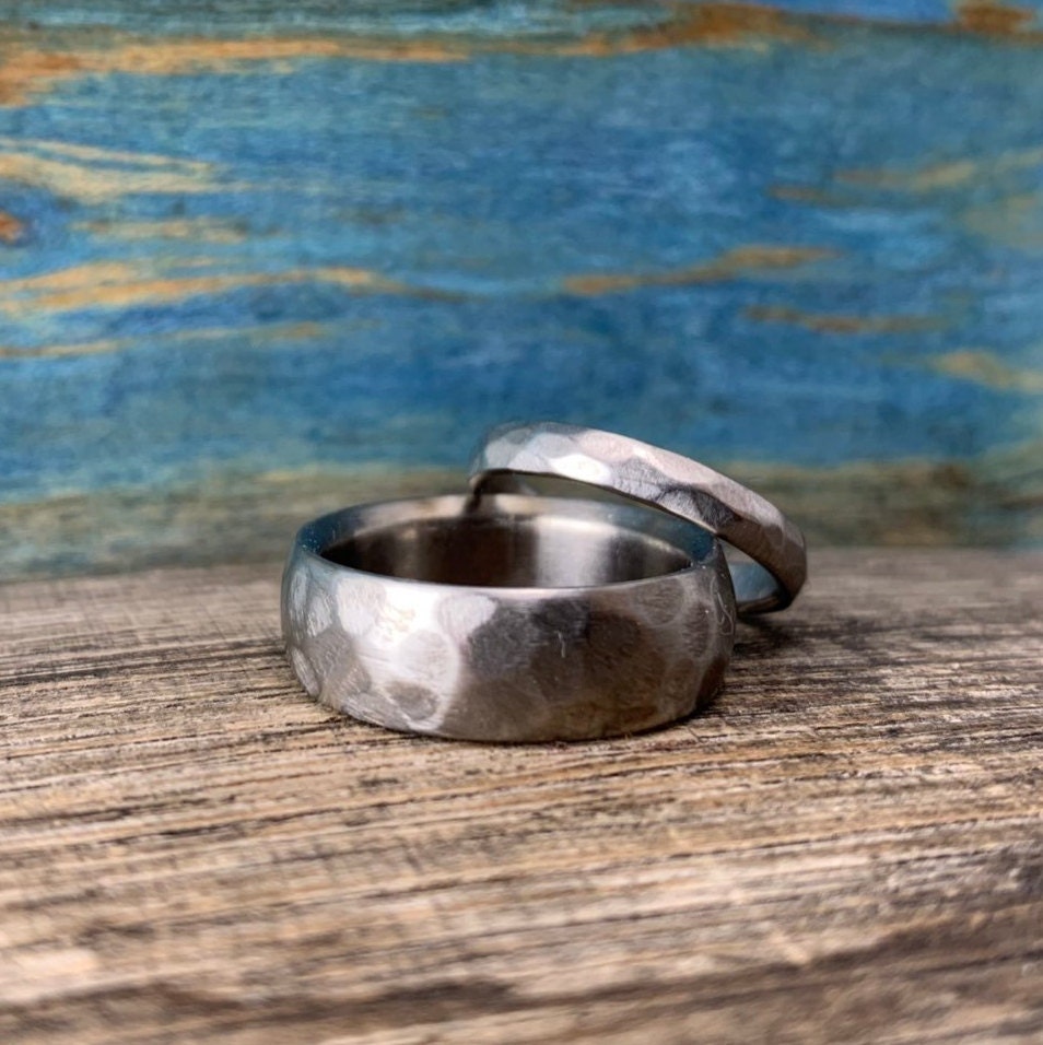 Handcrafted from start to finish, this distressed his and hers wedding ring set is perfectly simple. A hand applied finish gives each titanium ring in this matching ring set a truly unique look. Perfect as a wedding bands set for men or women, this matching his and hers ring set is also super versatile- they make excellent promise rings, best friend rings, anniversary rings, or alternative engagement rings as well!