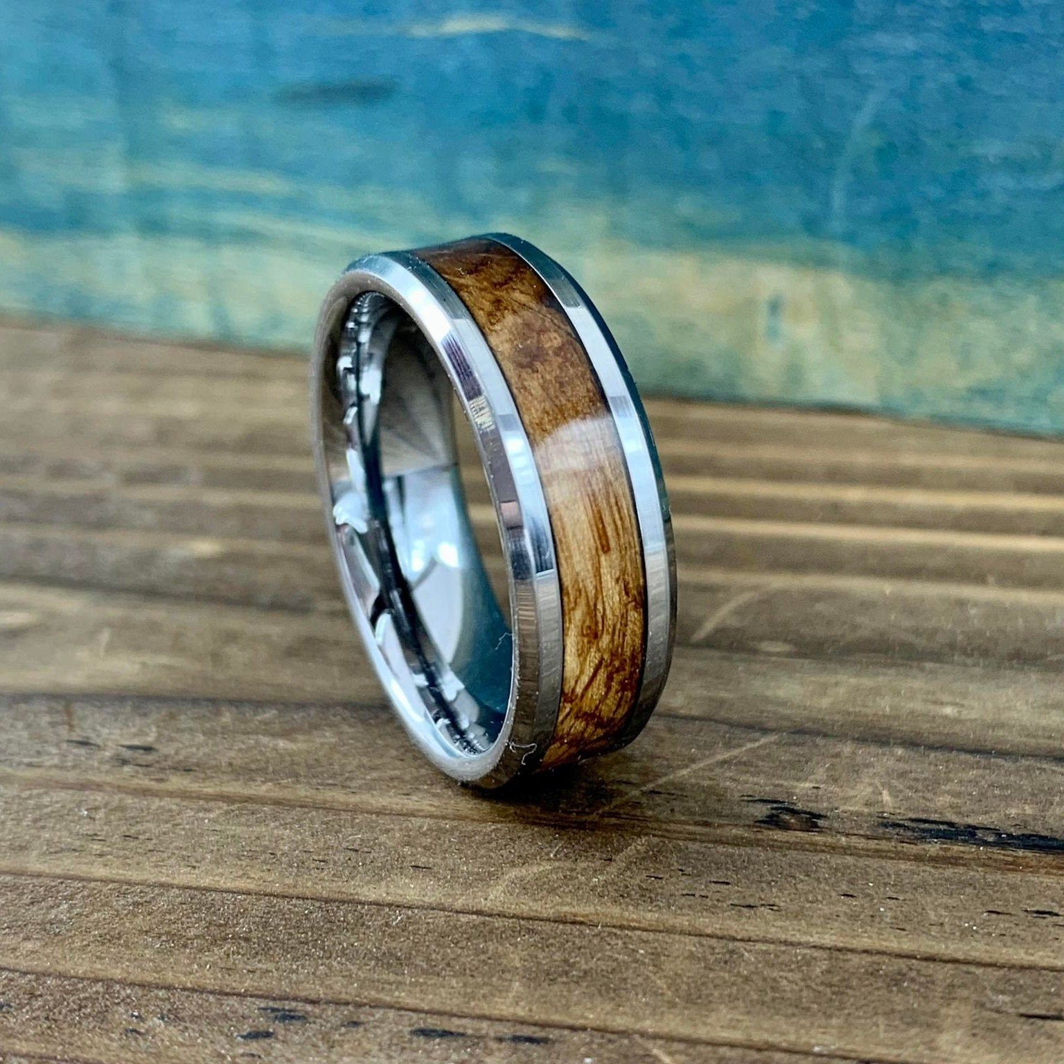 Tungsten carbide is incredibly strong and scratch-resistant, and it will not bend or tarnish, making it a wonderful choice for a wedding band. The silver polished band combined with rustic whiskey barrel wood creates a unique, undeniable presence when being worn - it looks even better in person! This artisan handcrafted ring is perfect for a men's wedding band, engagement ring, anniversary gift, promise ring, Valentines Day gift, or a birthday.